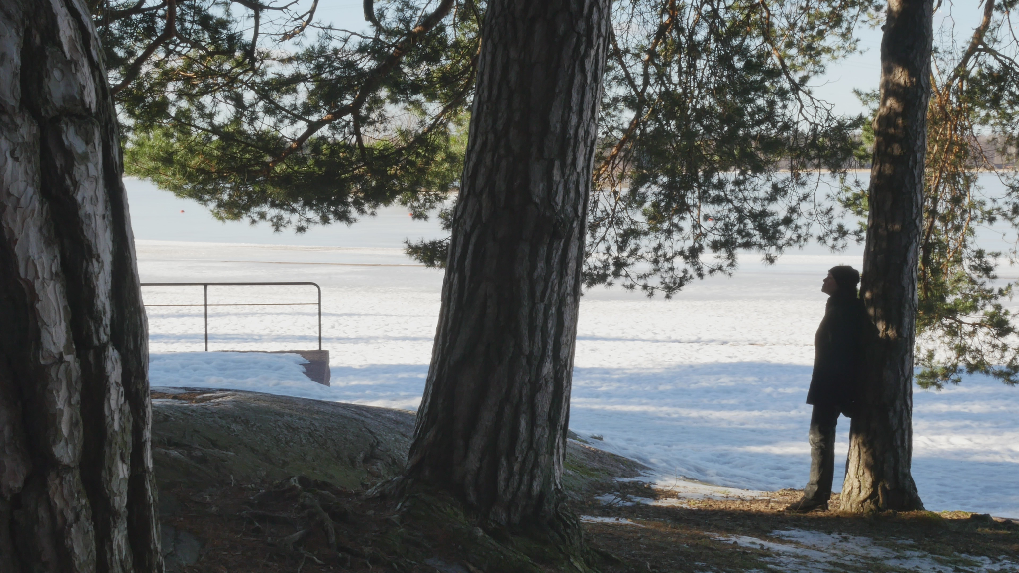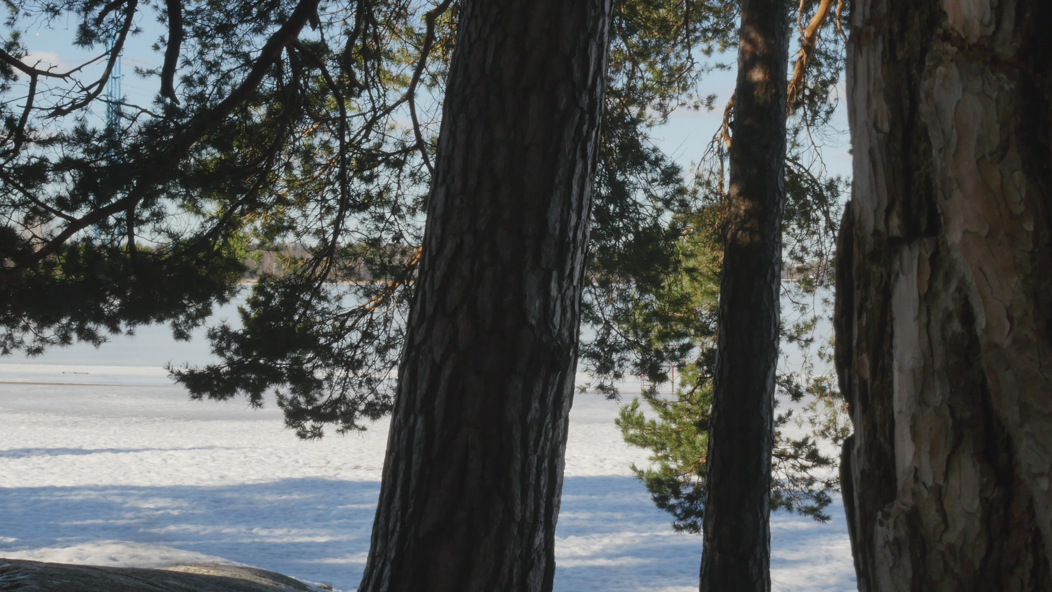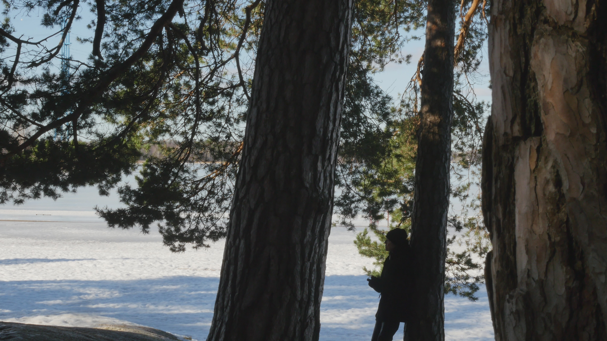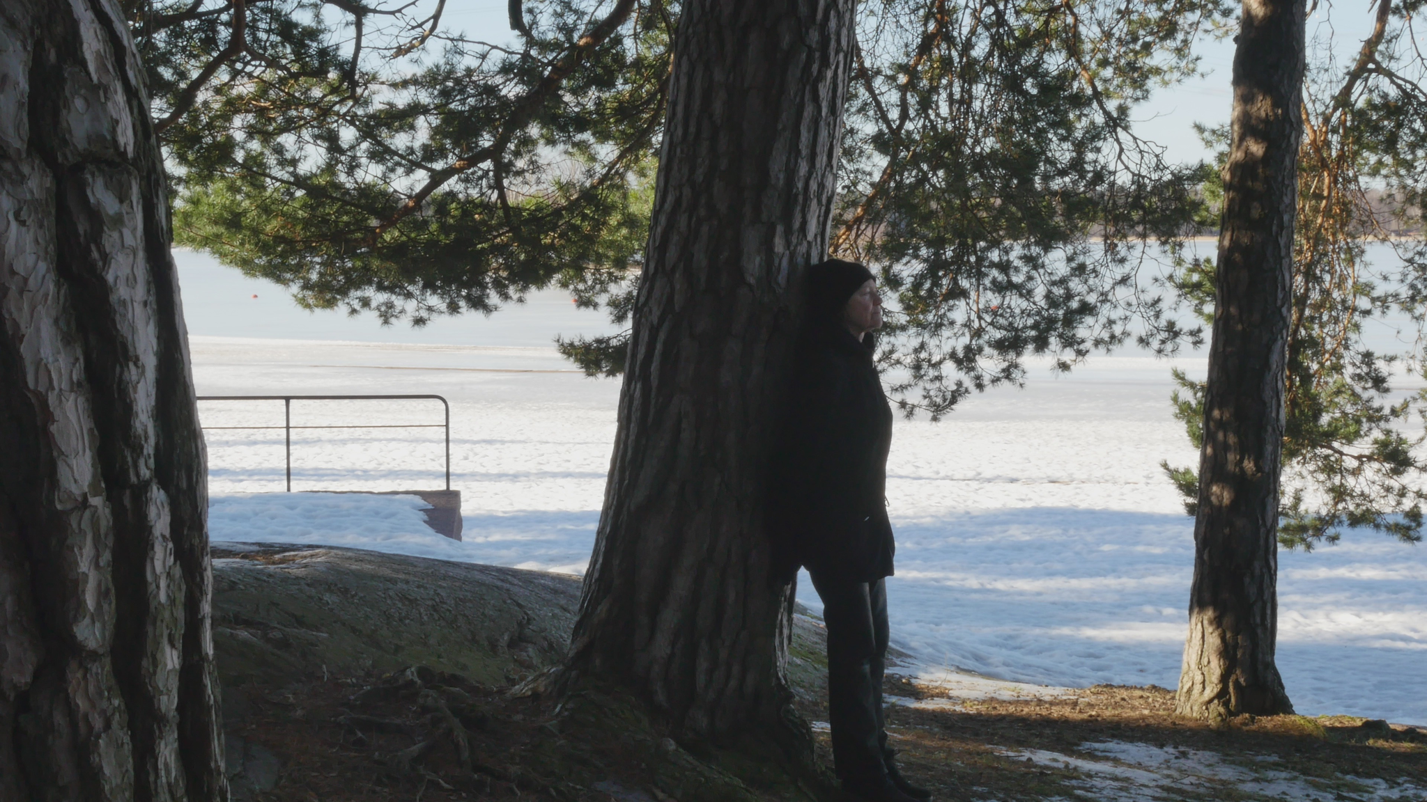 Hello Pine, hello. I was here once before but at the time I addressed you in Finnish. Now I try to speak in English, unfortunately, because I don't know 'Pinish' or pine language or what would be the best way to address you. Last time I was here the sun was shining; it was cold but now it's damp and grey and the snow is melting and the spring is coming, which is lovely. And you probably like that, too. Why I come to you this bluntly - I hope you don't mind my leaning on your trunk and trying to have a conversation with you. The reason I will try to do that is to think about this idea of citizenship. Well, I began by thinking of city dwelling actually, because in Finnish the word 'kaupunkilainen' means city dweller, citizen in that sense, whereas 'kansalainen' the 'nation dweller' would be then the citizen in the common understanding of the word, I suppose. And that may be a little bit far-fetched, but this idea of pine trees as citizens in terms of city dwellers is somehow very obvious here in Hietaniemi, where there is plenty of you, by the shore and near the beach. There is also a cemetery nearby and the beach is very popular in summertime, but you also make the place very beautiful because you create this place, this landscape right here. And of course, the idea of citizen in the terms of dweller in a city is relevant in terms of trees especially because the choice of place to live, rather than the official accreditation to a nation or a state or something like that, is sometimes very important in practice. So, we humans tend to think that we can freely move but for many people moving around it's not so easy. And even the people who would be technically and legally allowed to move or could afford that, they tend to stay in one place and maybe go away for holiday or something but they remain relatively rooted. Or at least they used to, especially in earlier times, where people were farmers but also the citizens of specific cities, which were like small mini-states in themselves. And of course you're very much rooted right here and have difficulty in moving far away from the place where you were born or where you settled when you started to grow. But of course your offspring can fly with birds or with the wind quite far. And over the generations you keep moving, of course. I also thought about this idea of city as sound, because here now today, maybe partly because of the wind or because there is not much foliage except for your needles to protect from the sound. The sound from the nearby highway or motorway, the western highway or 'Länsiväylä' is quite strong and I wonder if you're used to that sound, because at least we humans get very easily used to quite a lot of noise and then we're not aware that it stresses us, but we're not conscious of it, but our our body registers it anyway. And since plants are able to hear you probably also register the noise from the traffic. You probably also can hear me at the moment, but it might be that my voice is on a frequency that is uninteresting for you, so maybe you can't really distinguish my voice; you just, it just merges with the background noise. It's actually a bit lazy of me not to try to find out what kind of sounds pine trees best can hear, but it might be that that is not, there is no research on that yet. Because the understanding that plants can hear sounds and even emit some sort of sounds, is not that old as far as I understand. Well, old, maybe some indigenous traditions would have that knowledge but in like western science the idea that plants can hear sound, distinguish sound, is not very common or has not been accepted for a long time. Alright, maybe I shouldn't bother you more, but I thought I hope it's okay for you if I come to visit you a few times and, yes. I wish you a nice day and enjoy the fresh air with the humidity and moisture and of course all the light that now increases day by day. So, take care.