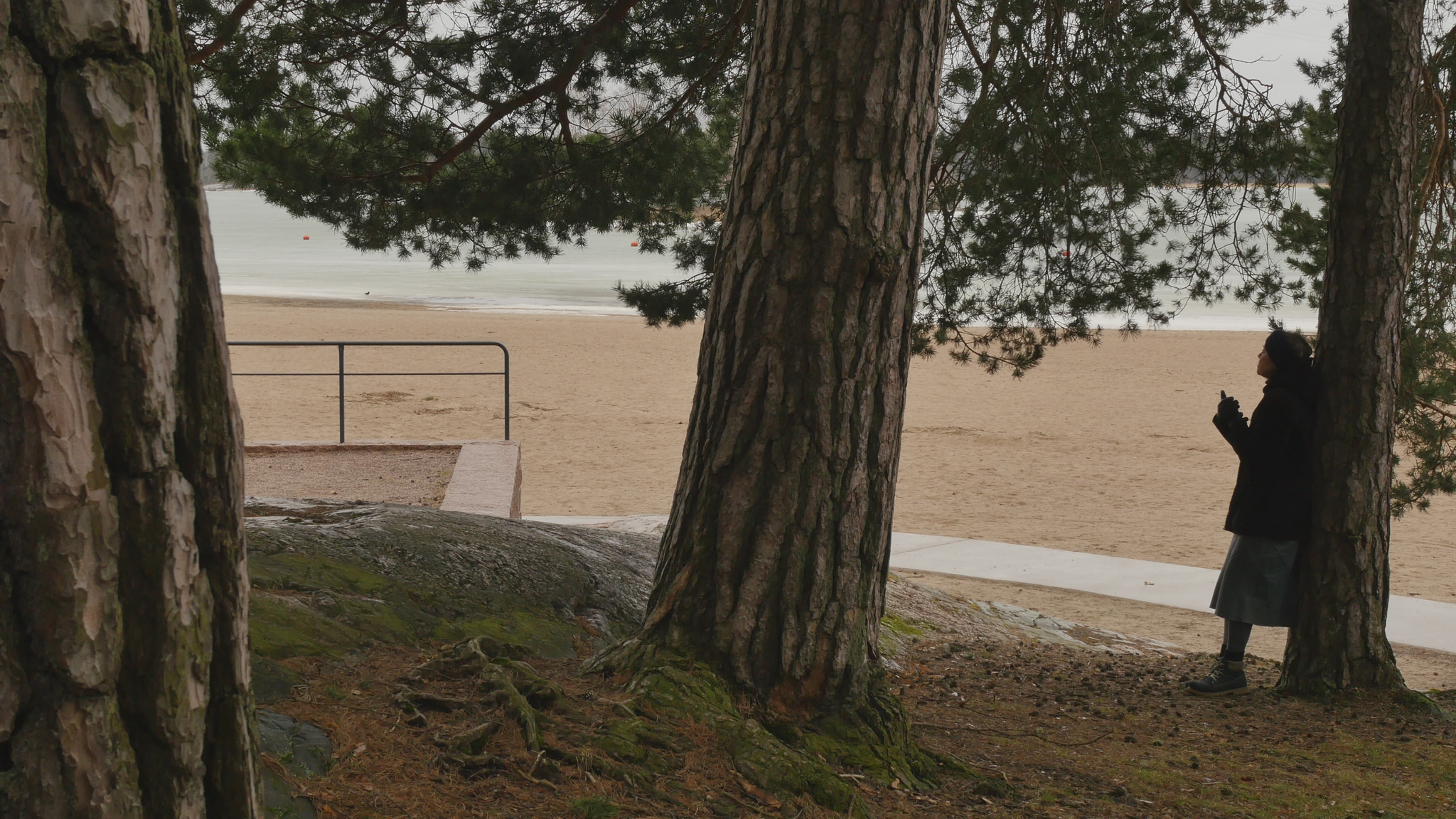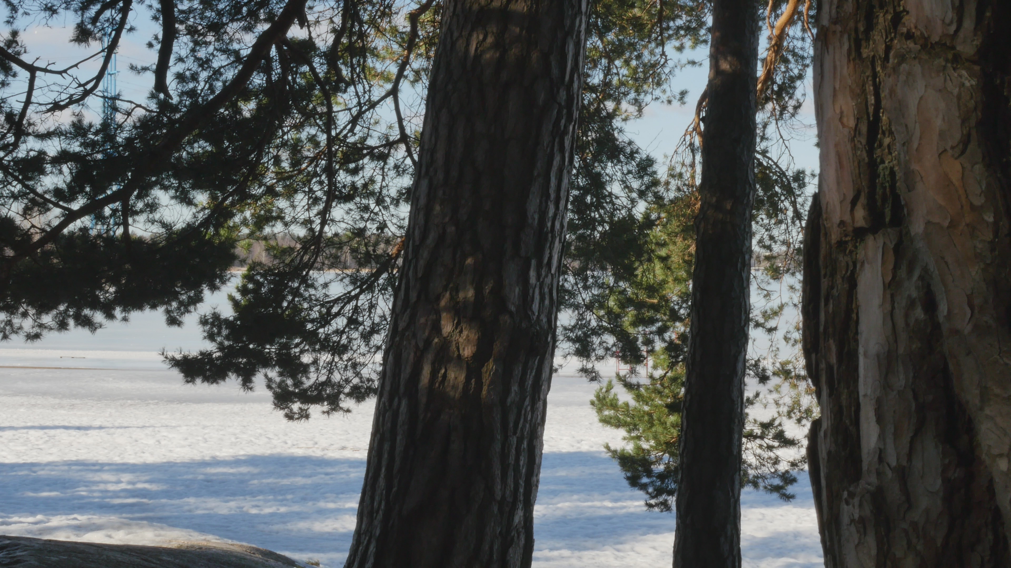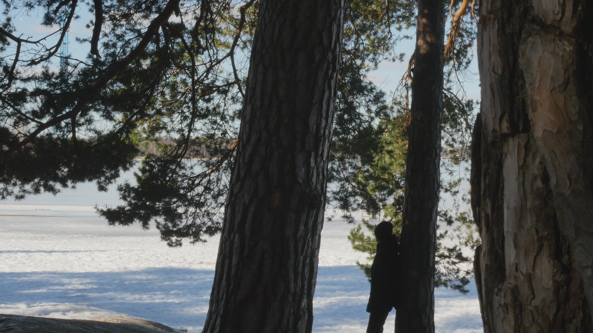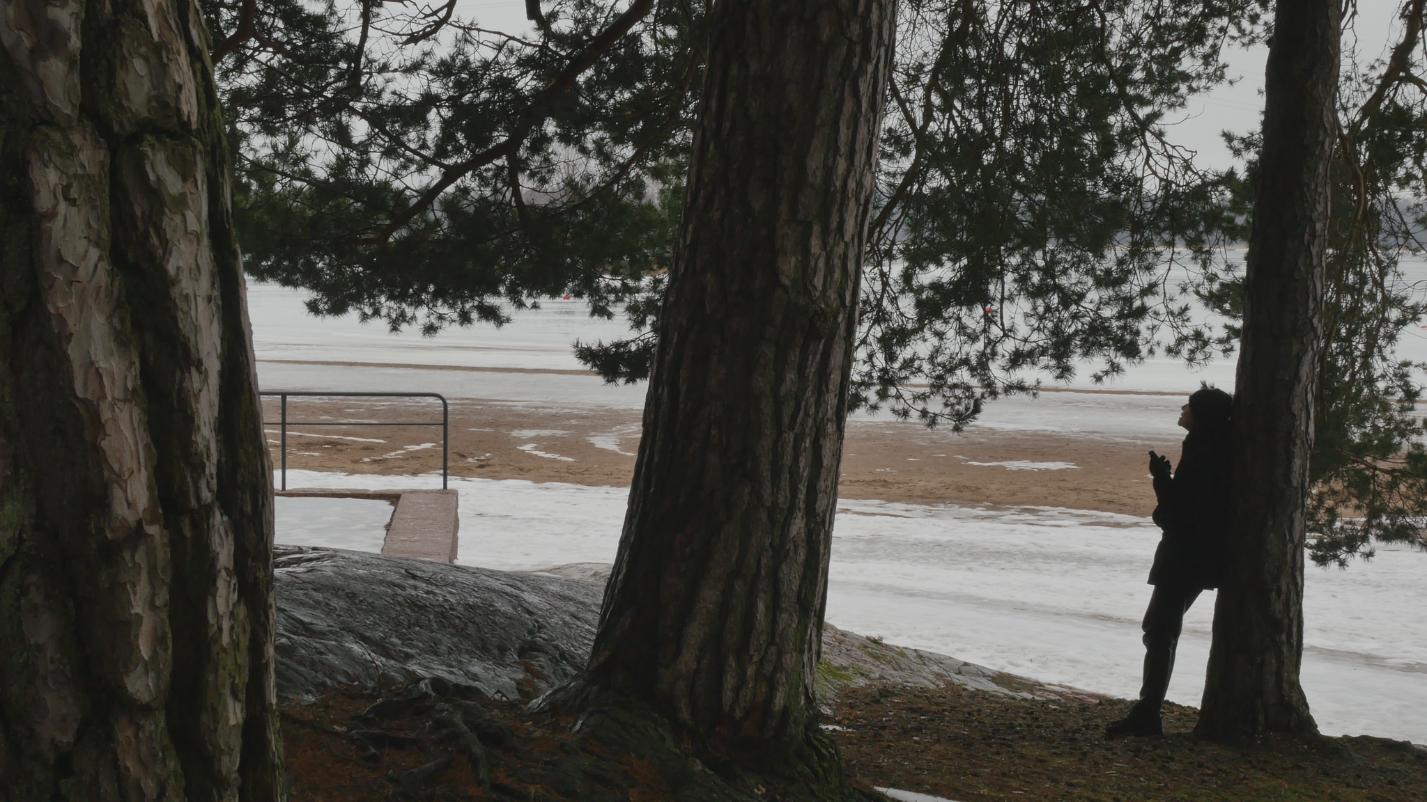Hello Pine, hello. I was here once before but at the time I addressed you in Finnish. Now I try to speak in English, unfortunately, because I don't know 'Pinish' or pine language or what would be the best way to address you. Last time I was here the sun was shining; it was cold but now it's damp and grey and the snow is melting and the spring is coming, which is lovely. And you probably like that, too. Why I come to you this bluntly - I hope you don't mind my leaning on your trunk and trying to have a conversation with you. The reason I will try to do that is to think about this idea of citizenship. Well, I began by thinking of city dwelling actually, because in Finnish the word 'kaupunkilainen' means city dweller, citizen in that sense, whereas 'kansalainen' the 'nation dweller' would be then the citizen in the common understanding of the word, I suppose. And that may be a little bit far-fetched, but this idea of pine trees as citizens in terms of city dwellers is somehow very obvious here in Hietaniemi, where there is plenty of you, by the shore and near the beach. There is also a cemetery nearby and the beach is very popular in summertime, but you also make the place very beautiful because you create this place, this landscape right here. And of course, the idea of citizen in the terms of dweller in a city is relevant in terms of trees especially because the choice of place to live, rather than the official accreditation to a nation or a state or something like that, is sometimes very important in practice. So, we humans tend to think that we can freely move but for many people moving around it's not so easy. And even the people who would be technically and legally allowed to move or could afford that, they tend to stay in one place and maybe go away for holiday or something but they remain relatively rooted. Or at least they used to, especially in earlier times, where people were farmers but also the citizens of specific cities, which were like small mini-states in themselves. And of course you're very much rooted right here and have difficulty in moving far away from the place where you were born or where you settled when you started to grow. But of course your offspring can fly with birds or with the wind quite far. And over the generations you keep moving, of course. I also thought about this idea of city as sound, because here now today, maybe partly because of the wind or because there is not much foliage except for your needles to protect from the sound. The sound from the nearby highway or motorway, the western highway or 'Länsiväylä' is quite strong and I wonder if you're used to that sound, because at least we humans get very easily used to quite a lot of noise and then we're not aware that it stresses us, but we're not conscious of it, but our our body registers it anyway. And since plants are able to hear you probably also register the noise from the traffic. You probably also can hear me at the moment, but it might be that my voice is on a frequency that is uninteresting for you, so maybe you can't really distinguish my voice; you just, it just merges with the background noise. It's actually a bit lazy of me not to try to find out what kind of sounds pine trees best can hear, but it might be that that is not, there is no research on that yet. Because the understanding that plants can hear sounds and even emit some sort of sounds, is not that old as far as I understand. Well, old, maybe some indigenous traditions would have that knowledge but in like western science the idea that plants can hear sound, distinguish sound, is not very common or has not been accepted for a long time. Alright, maybe I shouldn't bother you more, but I thought I hope it's okay for you if I come to visit you a few times and, yes. I wish you a nice day and enjoy the fresh air with the humidity and moisture and of course all the light that now increases day by day. So, take care.