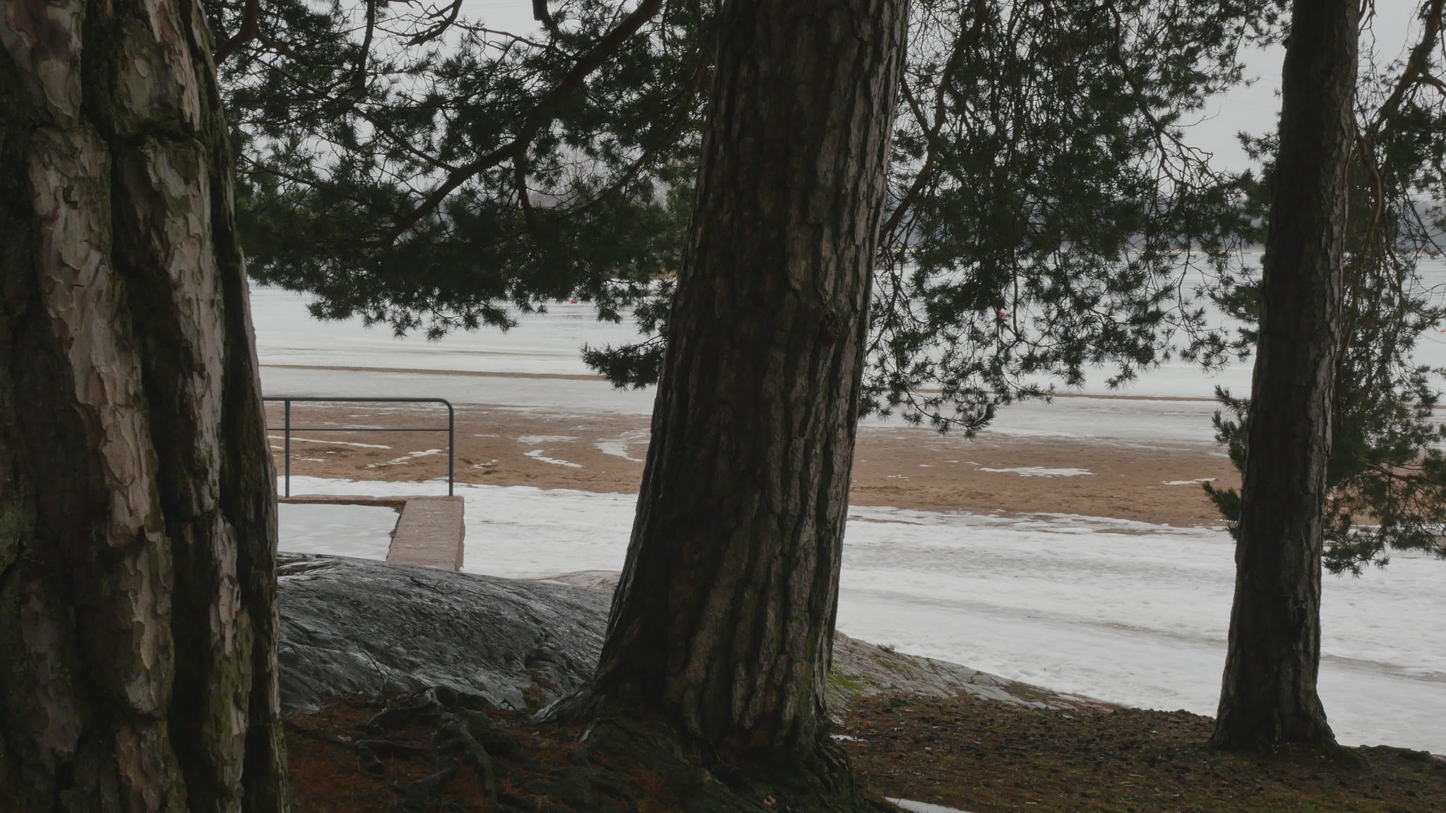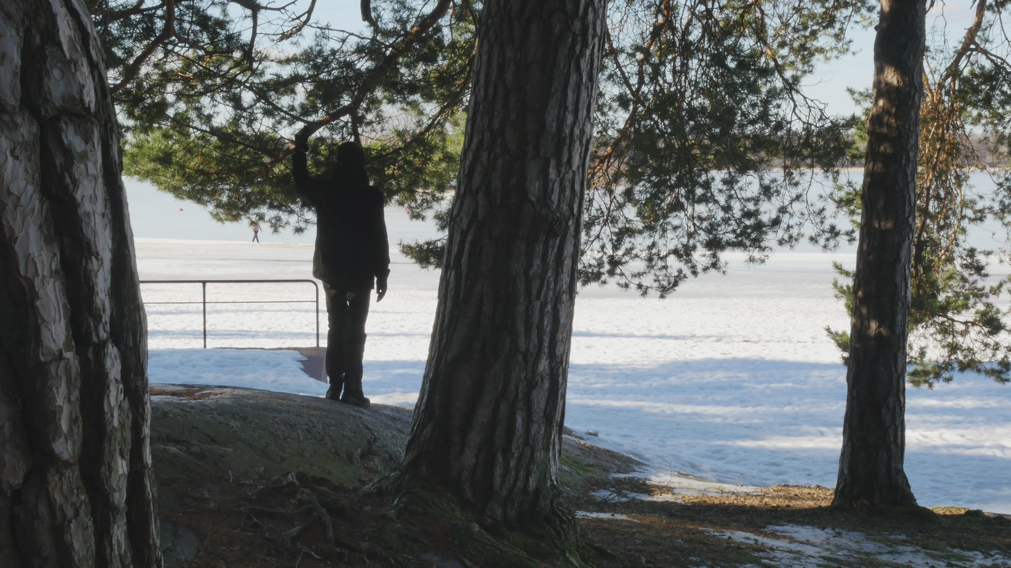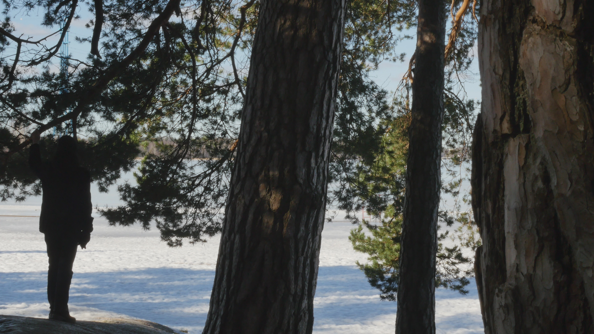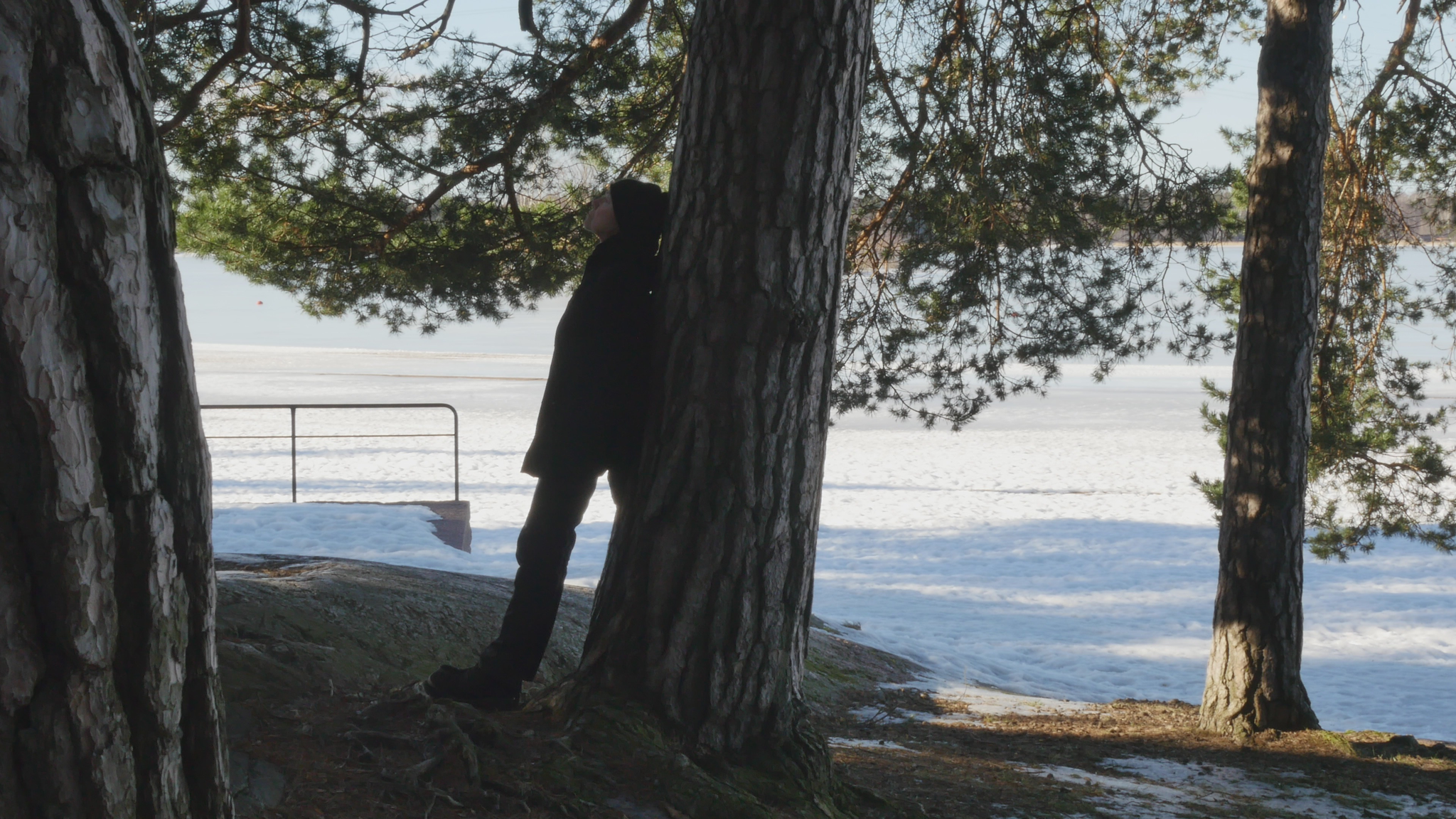 Hello Pine, hello. I was here once before but at the time I addressed you in Finnish. Now I try to speak in English, unfortunately, because I don't know 'Pinish' or pine language or what would be the best way to address you. Last time I was here the sun was shining; it was cold but now it's damp and grey and the snow is melting and the spring is coming, which is lovely. And you probably like that, too. Why I come to you this bluntly - I hope you don't mind my leaning on your trunk and trying to have a conversation with you. The reason I will try to do that is to think about this idea of citizenship. Well, I began by thinking of city dwelling actually, because in Finnish the word 'kaupunkilainen' means city dweller, citizen in that sense, whereas 'kansalainen' the 'nation dweller' would be then the citizen in the common understanding of the word, I suppose. And that may be a little bit far-fetched, but this idea of pine trees as citizens in terms of city dwellers is somehow very obvious here in Hietaniemi, where there is plenty of you, by the shore and near the beach. There is also a cemetery nearby and the beach is very popular in summertime, but you also make the place very beautiful because you create this place, this landscape right here. And of course, the idea of citizen in the terms of dweller in a city is relevant in terms of trees especially because the choice of place to live, rather than the official accreditation to a nation or a state or something like that, is sometimes very important in practice. So, we humans tend to think that we can freely move but for many people moving around it's not so easy. And even the people who would be technically and legally allowed to move or could afford that, they tend to stay in one place and maybe go away for holiday or something but they remain relatively rooted. Or at least they used to, especially in earlier times, where people were farmers but also the citizens of specific cities, which were like small mini-states in themselves. And of course you're very much rooted right here and have difficulty in moving far away from the place where you were born or where you settled when you started to grow. But of course your offspring can fly with birds or with the wind quite far. And over the generations you keep moving, of course. I also thought about this idea of city as sound, because here now today, maybe partly because of the wind or because there is not much foliage except for your needles to protect from the sound. The sound from the nearby highway or motorway, the western highway or 'Länsiväylä' is quite strong and I wonder if you're used to that sound, because at least we humans get very easily used to quite a lot of noise and then we're not aware that it stresses us, but we're not conscious of it, but our our body registers it anyway. And since plants are able to hear you probably also register the noise from the traffic. You probably also can hear me at the moment, but it might be that my voice is on a frequency that is uninteresting for you, so maybe you can't really distinguish my voice; you just, it just merges with the background noise. It's actually a bit lazy of me not to try to find out what kind of sounds pine trees best can hear, but it might be that that is not, there is no research on that yet. Because the understanding that plants can hear sounds and even emit some sort of sounds, is not that old as far as I understand. Well, old, maybe some indigenous traditions would have that knowledge but in like western science the idea that plants can hear sound, distinguish sound, is not very common or has not been accepted for a long time. Alright, maybe I shouldn't bother you more, but I thought I hope it's okay for you if I come to visit you a few times and, yes. I wish you a nice day and enjoy the fresh air with the humidity and moisture and of course all the light that now increases day by day. So, take care.