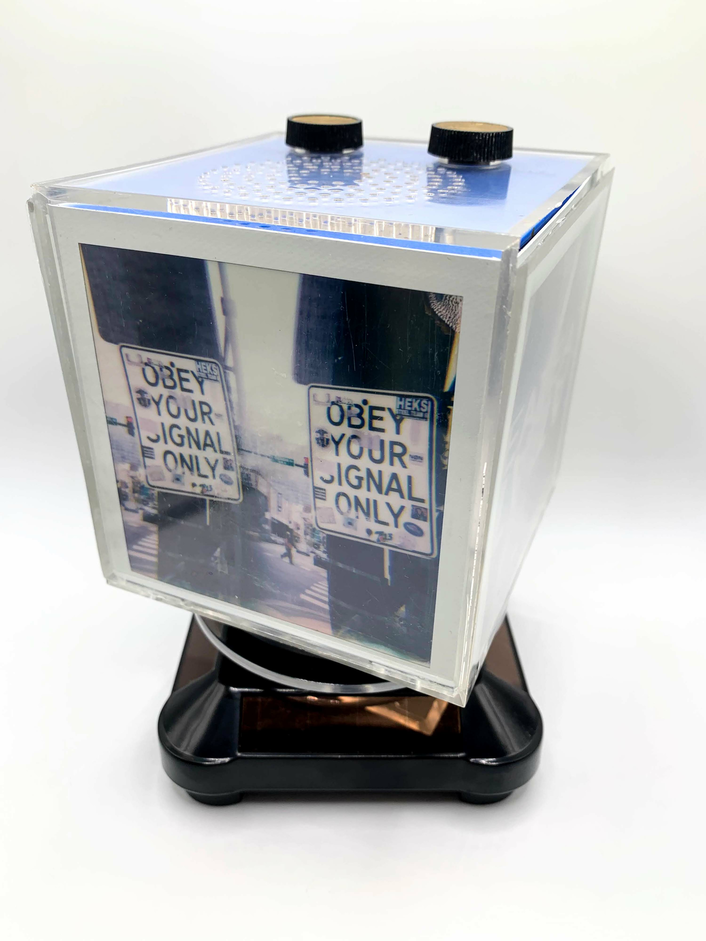 “Low Fidelity” is the first iteration of an interactive sculptural installation. It consists of ten vintage AM transistor radio photo cubes, and 40 Polaroid 600 film photographs taken using a multi-image lens. They rotate atop solar-powered platforms to allow an uninterrupted 360 degree view. The radios play simultaneously; their signal strengths vary and are highly susceptible to interference from passing electronics and each other, which leads to highly unpredictable and often low audio fidelity.