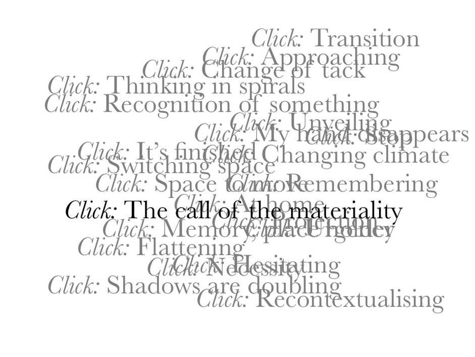 Second — ‘marking’. We seek notational systems for indicating the moments of emergent ‘figuring’, the shifts in awareness or affordance. Notation of a notion or even inkling, a system of signs for a ‘something’ that has yet to come into words. So far, within the context of our live explorations we have practiced a system of marking through clicking, where we each make an audible sound that acknowledges a shift in our awareness, as a means marking or signaling ‘something is happening’. This process is recorded on video. The recording is admittedly a deficient tool for capturing the nature of the unfolding live activity —rather its task is indexical, to capture the ‘clicks’ in the context of their production. It enables us to reenter the situation after-the-event, a means in Goethean terms (as Alex observed) for “dwelling in the phenomenon”.11