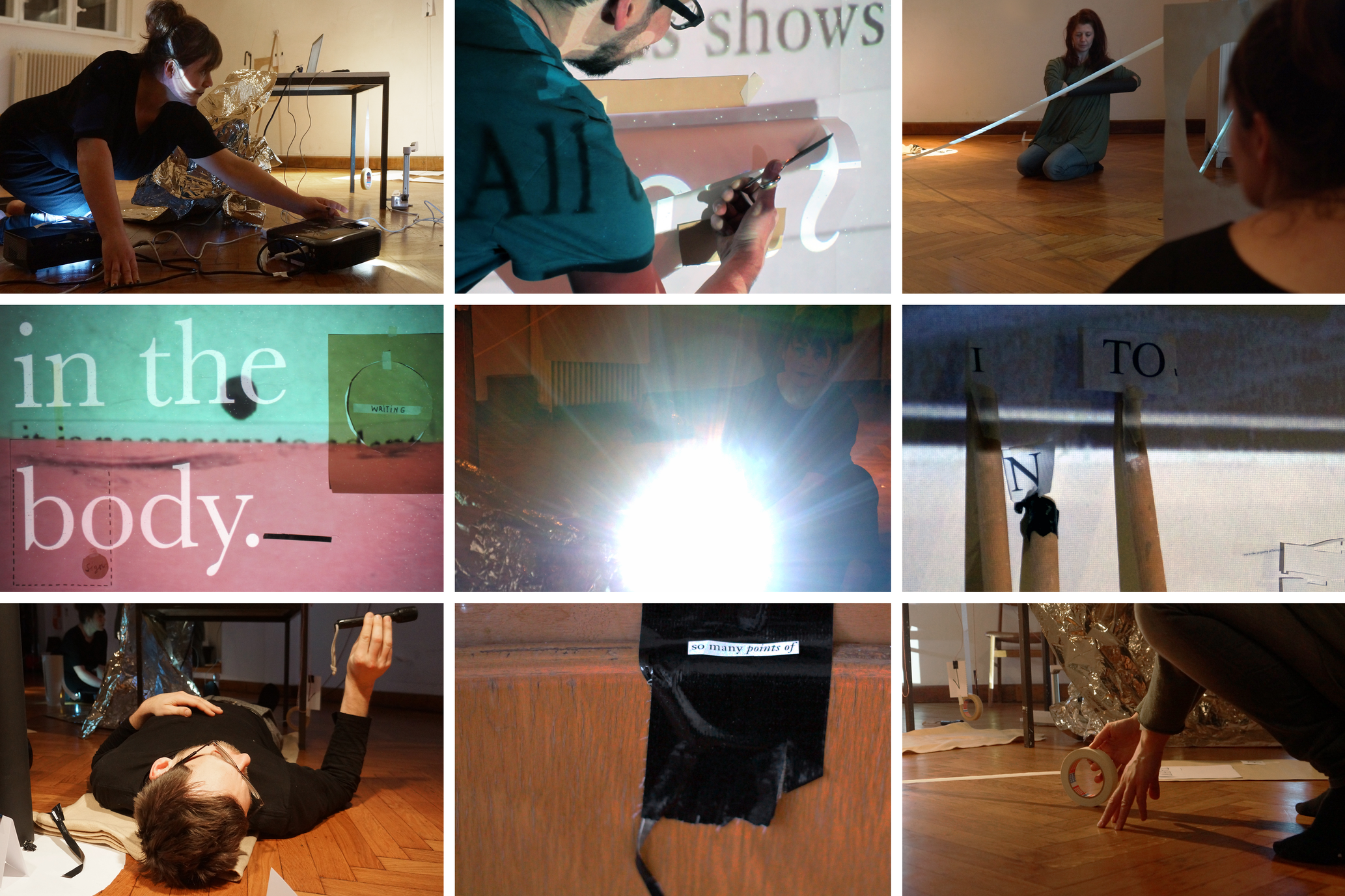 Method Lab in Progress/Process: The documentation (above) captures moments of the ‘live explorations’, which form a core part of our working methodology. The ‘live explorations’ are specific, time-bound episodes (usually lasting between 1 — 2 hours) in which we engage in a process of experimental ‘thinking-in-action’, shifting between individual explorations related to our own interests in expanded forms of drawing / writing / choreography, and more collaborative encounters emerging through an improvisatory process of working together in a shared environment. The photographic documentation (above) is from different stages of the prelude phase / first year of our research project (See chronology for details). Photography was produced within the lab itself by us as the key researchers (Emma Cocker, Nikolaus Gansterer and Mariella Greil) as well as by our invited documenters Simona Koch and Julian Hughes.