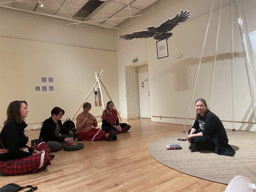 Säi'mm group and Ájtte museum staff discussed the Forced Migration exhibition and related histories while making craft.