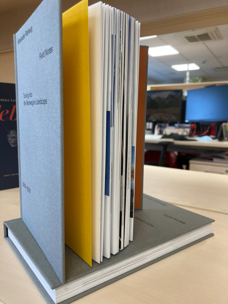 We were discussing different sizes and cover materials and I came up with examples of old travel log and explorer books. I knew I wanted to use canvas, we started using that on the Y-album photo publication, I really like the tactility and texture. We ended up using a medium grey coloured canvas, not too rough. It looked a bit artsy but also a bit solid and old. In the end I was super happy with the result, such a nice product and collection of my field work and the Norwegian landscape. The fact we managed to get it to Tromsø in time (even though there were delays and Covid-19) was incredible.