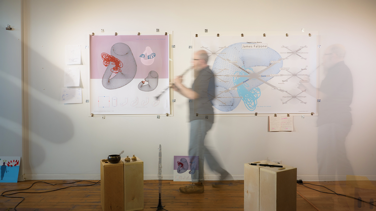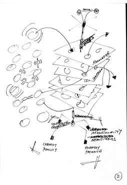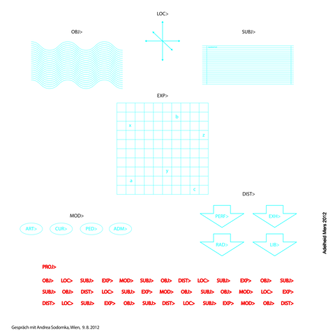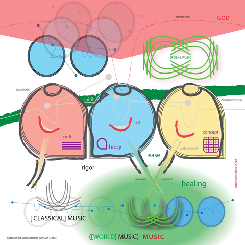 Ich lernte Doris Ingrisch (Universitätsprofessorin für Gender Studies), unter vielem anderen an künstlerischen Werdegängen interessiert, 2012 am IKM durch Katharina Pfenningstorf (Leiterin des Universitätslehrgangs Aufbaustudium Kulturmanagement) kennen. Doris Ingrisch brachte mich mit Andrea Sodomka (Komponistin, Medienkünstlerin und Kuratorin) zusammen. Im Gespräch mit Andrea Sodomka und dann auch mit Maria Gstättner (Musikerin, Fagottspielerin, Komponistin), die 2013 eingebracht wurde, zeichneten sich neue Erkennnisse ab, zuerst dadurch gekennzeichnet, daß beide mit grossem Gusto bereit waren, auf Gesprächsdiagramme mit Kompositionen zu reagieren. Damit erfüllte sich mein Wunsch, die postulierte pragmatische Potenz der Diagramme durch Folgeaktionen zu aktivieren. Doris Ingrisch brachte mich im Herbst 2014 nach Wien zurück, diesmal um ausschliesslich mit Kulturschaffenden im Bereich Sound, Musik und Komposition in Dialog zu treten. Der erste Zyklus war inzwischen auch in Chicago ausgestellt worden.