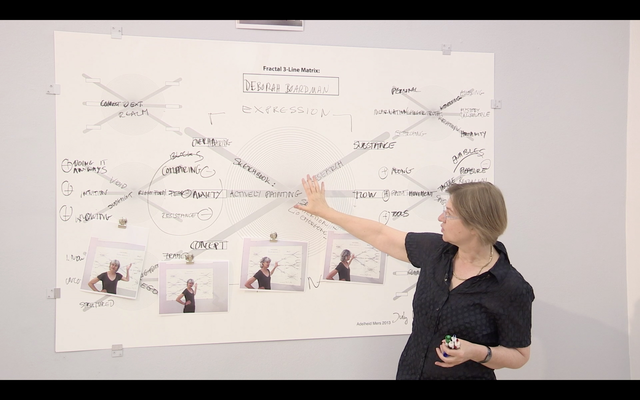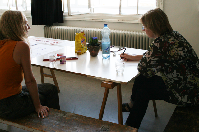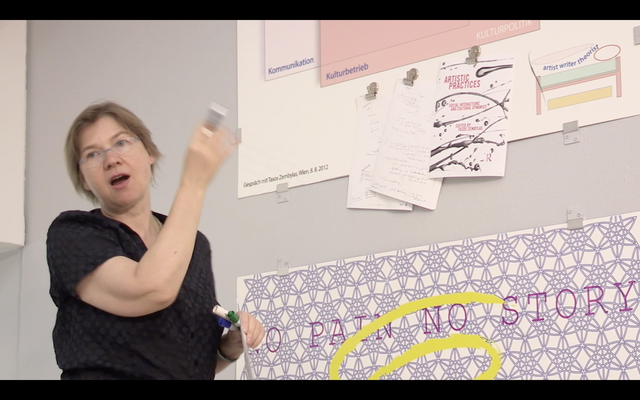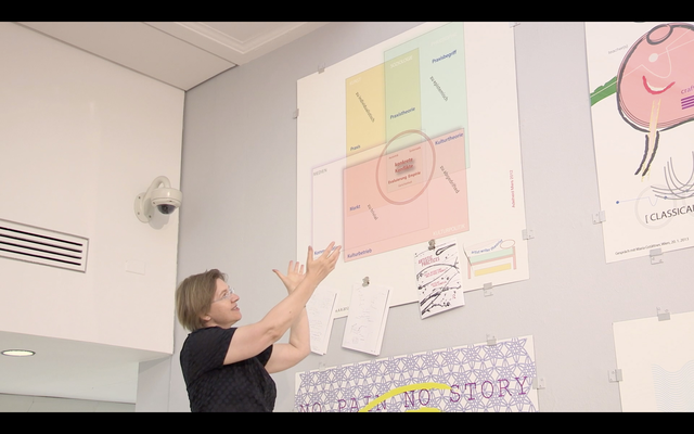 Diagramme stellen nicht nur Relationen dar, sondern markieren auch Aufmerksamkeit. Diagrammatisches Handeln, als zeichnerisches und bildnerisches Denken, folgt sowohl dichten als auch tentativen, tastenden Aufmerksamkeitsströmen durch Beziehungsformationen. Dabei gehen Auswahl und analytischer Schnitt der räumlichen in-Beziehungsetzung voraus. Arrangements werden topologisch durchgewalkt, bis das Konstrukt bis zum Äussersten, das in diesem Moment möglich war geformt worden ist. Dann steht es zur Abholung bereit. Als ich beschloss, Künstlergespräche zu Arbeitsweisen ins Zentrum meines Forschungsjahres 2012/13, und damit auch meiner Zeit in Wien (IKM/UMW) und Krems (A.I.R.) zu stellen, wollte ich nicht nur herausfinden, wie Kunstschaffende handelnd denken und ihre professionellen Episteme herausbilden, sondern auch ob und wie sie daran interessiert sein könnten, mit meinen Diagrammen weiter umzugehen. Welches ist das Potenzial der Diagramme als Wandtafeln?