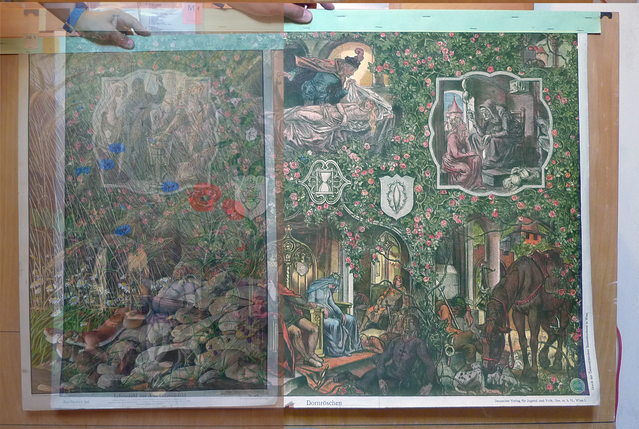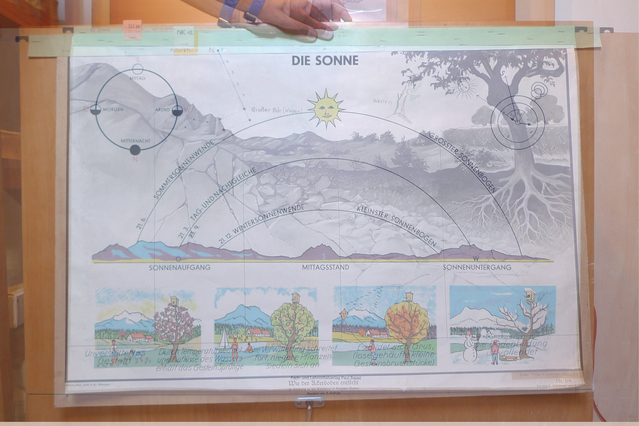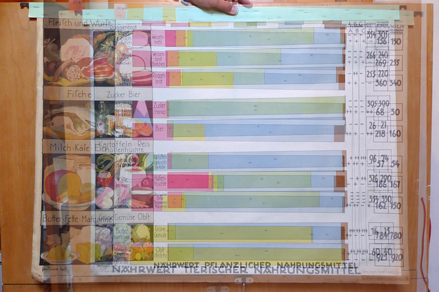 Ich sehe meine Diagrammatische Arbeitsweise im Umkreis der Lehrtafeln oder Wandbilder, die vor allem im deutschsprachigen Raum noch bis zur Mitte des 20sten Jahrhunderts zum Gebrauch in Schulen produziert wurden. Als visuelle Analyse präsentierten sie die Auflösung des Objekts in der Darstellung des Wissensprozesses und lehrten damit Inhalte sowohl als auch Methoden der Wissensaneignung und Wissensschaffung in einem - kritisches Denken, spielhaft zu erfahren im Prozess räumlicher Kontextualisierung. Die Grundlage zu meinem Interesse an Interpretation und Epistemologie wurden hier wohl gelegt. Zu meiner Grundschulzeit in den 1960iger Jahren waren diese Anschauungsbilder noch präsent. Hier (oben links) sind einige, nun collagierte Exemplare eines umfangreicheren Archivs, die mir der Lehrer Wolfgang Müllner in einer Schule nahe Krems zeigen konnte, während ich im Sommer 2012 A.I.R. Krems Residentin war.