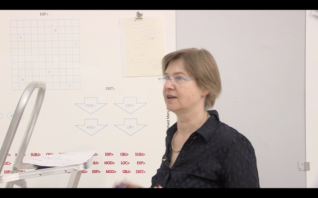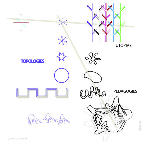 Diagramme stellen nicht nur Relationen dar, sondern markieren auch Aufmerksamkeit. Diagrammatisches Handeln, als zeichnerisches und bildnerisches Denken, folgt sowohl dichten als auch tentativen, tastenden Aufmerksamkeitsströmen durch Beziehungsformationen. Dabei gehen Auswahl und analytischer Schnitt der räumlichen in-Beziehungsetzung voraus. Arrangements werden topologisch durchgewalkt, bis das Konstrukt bis zum Äussersten, das in diesem Moment möglich war geformt worden ist. Dann steht es zur Abholung bereit. Als ich beschloss, Künstlergespräche zu Arbeitsweisen ins Zentrum meines Forschungsjahres 2012/13, und damit auch meiner Zeit in Wien (IKM/UMW) und Krems (A.I.R.) zu stellen, wollte ich nicht nur herausfinden, wie Kunstschaffende handelnd denken und ihre professionellen Episteme herausbilden, sondern auch ob und wie sie daran interessiert sein könnten, mit meinen Diagrammen weiter umzugehen. Welches ist das Potenzial der Diagramme als Wandtafeln?