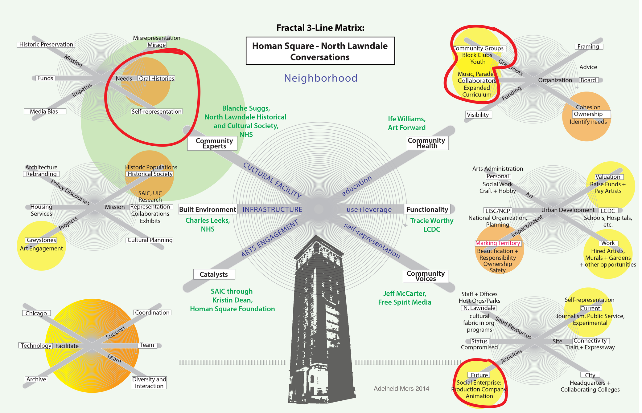 The three main axes of the Homan Square diagram are determined by the terms Cultural Facility (self-representation), Infrastructure (use + leverage) and Arts Engagement (education). Each node represents one key conversation. While this is not an exhaustive selection, the participants know each other professionally and have histories of strong mutual support in creating and leveraging organizations to improve their neighborhood. They made sure to include many other local actors and activities.