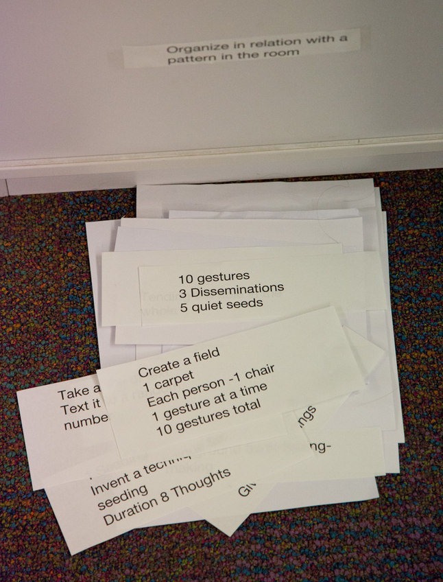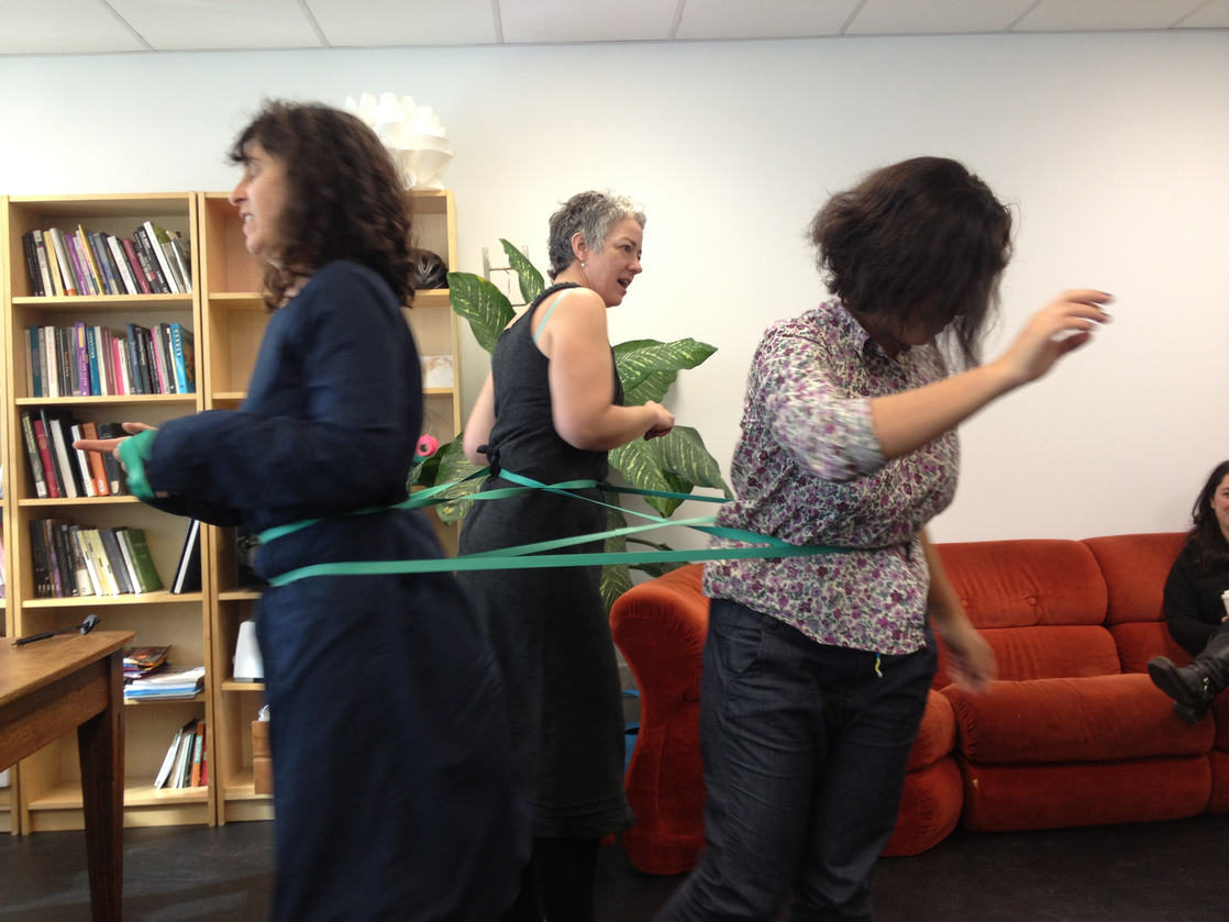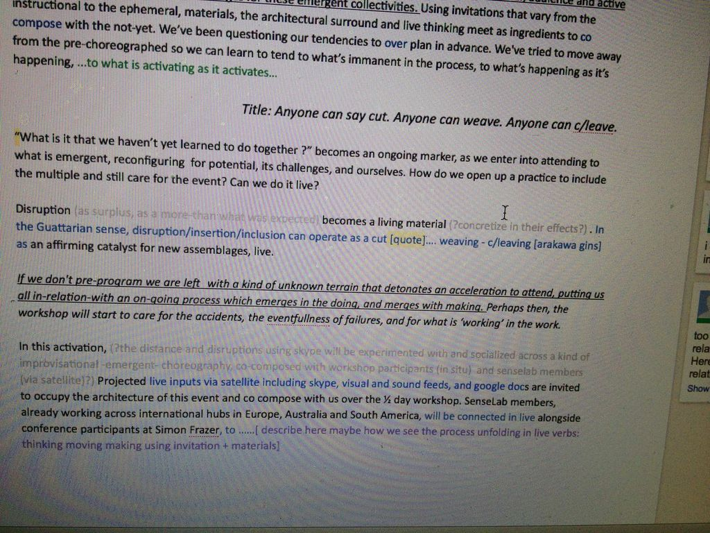 We've been questioning our tendencies to plan in advance. We've tried to move away from the pre-choreographed so we can learn to tend to what’s immanent in the process, to what’s happening as it’s happening. If we don't pre-program we are left with a kind of unknown terrain that detonates an acceleration to attend, putting us all in-relation-with an on-going process which emerges in the doing, and merges with making.