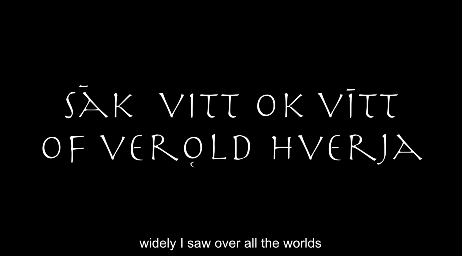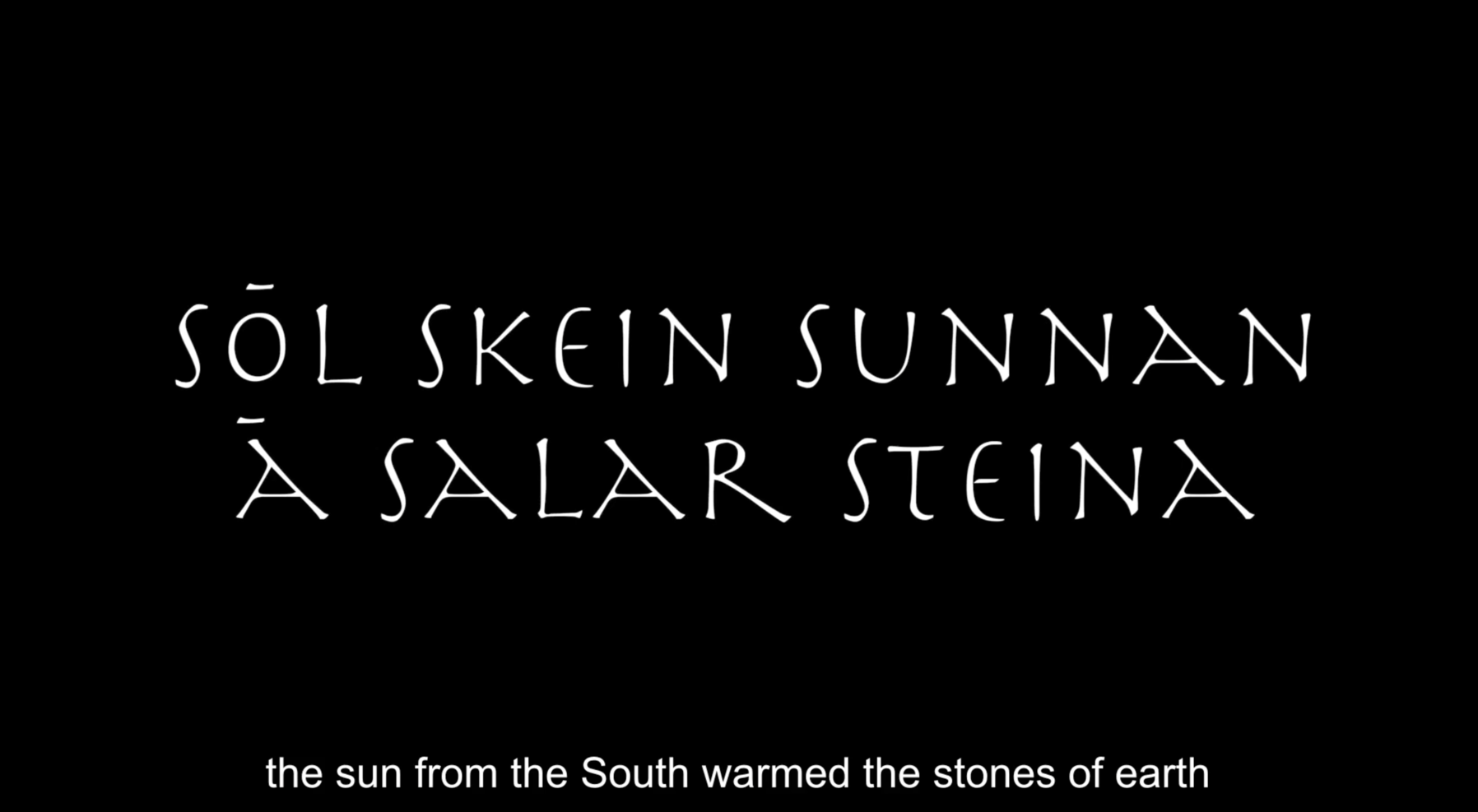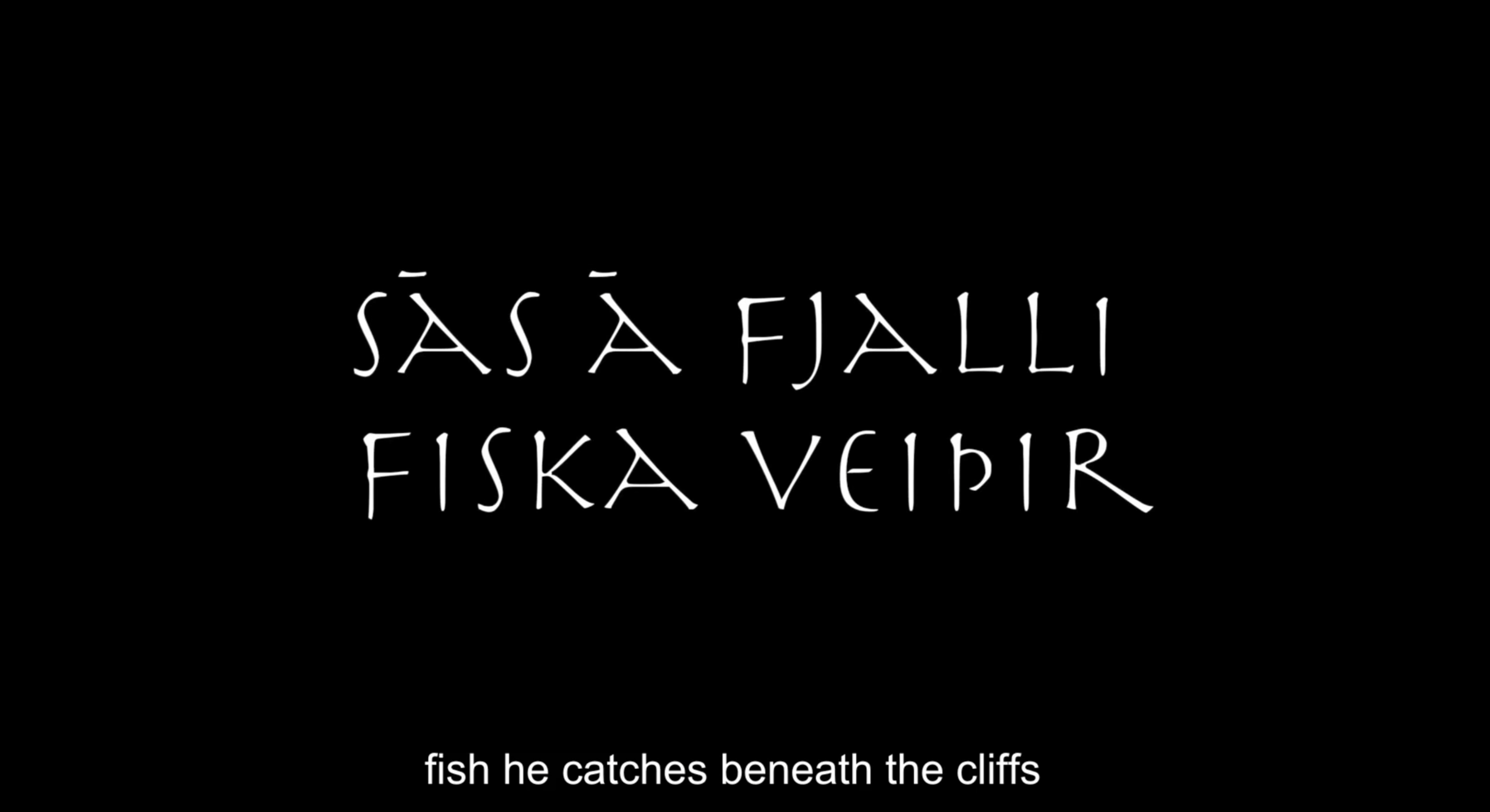Sāk vitt ok vītt of verǫld hverja title originates in Völuspá, the first and most famous poem of the Poetic Edda written in Old Norse and narrating the story of the creation of the world and its coming end. Verses from Völuspá are utilised throughout the movie and the multimedia performances, typically preambling the audiovisual content to follow so that loose micro-narratives are shaped. Performances would typically pivot on just a few such micro-narratives, while the film features nine of them —these are all given below. With just a couple of exceptions, the verses used describe, or somehow refer to, other-than-human things and relations thereof. So that to some extend (and very often aided by appropriate audiovisual material) they function ontographically, and possibly also metaphorically2; that is, acknowledging the presence of objects in a place and underscoring the tensions forged between one another. For instance, “the sun from the South warmed the stones of earth”, “green was the ground, with growing leeks”, or “the cataracts fall and the eagle flies” (followed by footage pinpointing the specifics of such couplings) arguably operate in such a fashion. This is just one of their possible functions, however. Given the exact wording, the fact they are given in Old Norse (there are subtitles in the film, but typically not during performances), and their historical significance to the local culture, they can be said to operate at no less than three levels simultaneously or alternately (all three veins pinpoint particular material and socio-cultural qualities and are further explored through other kinds of prose, too):