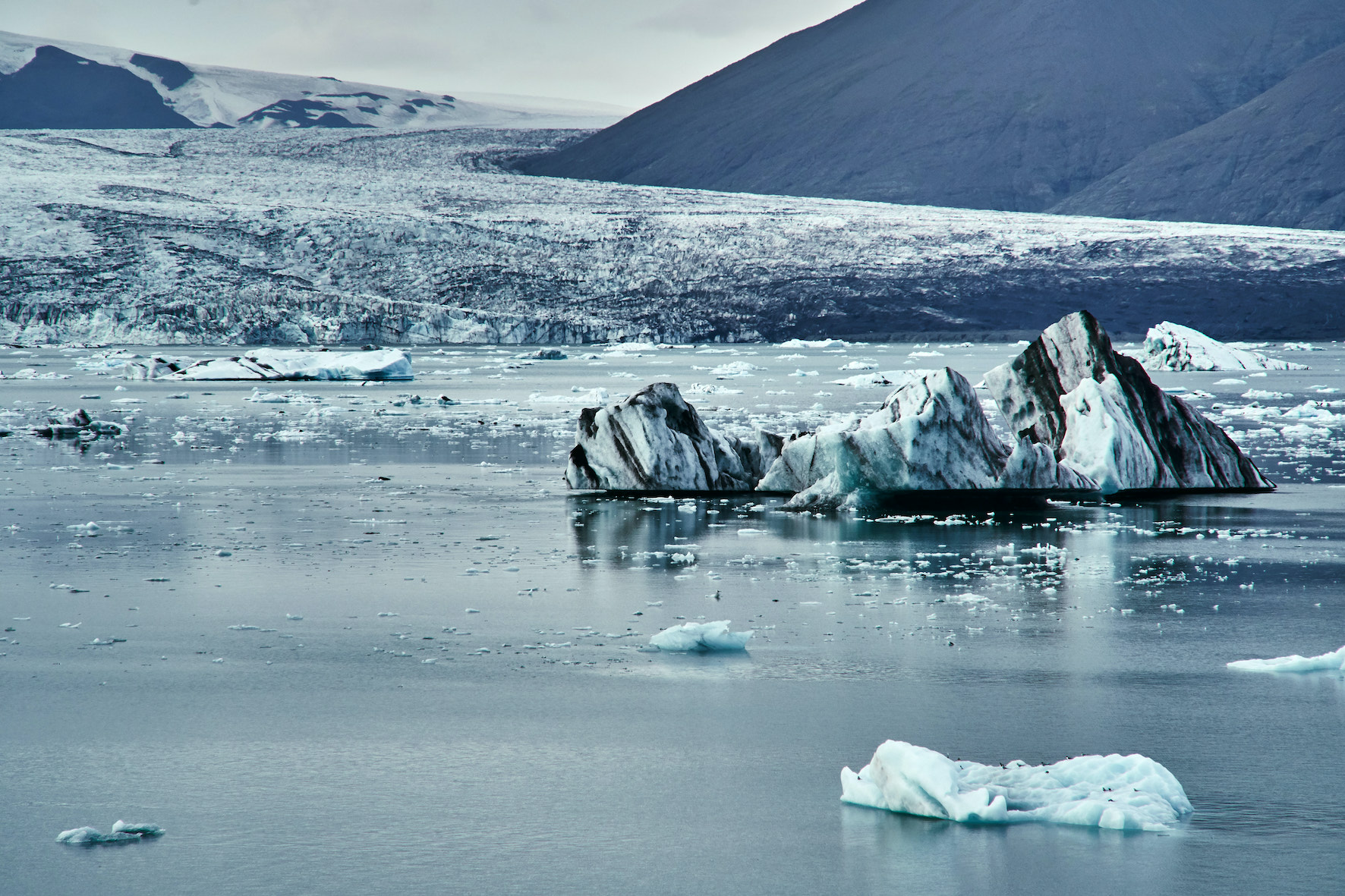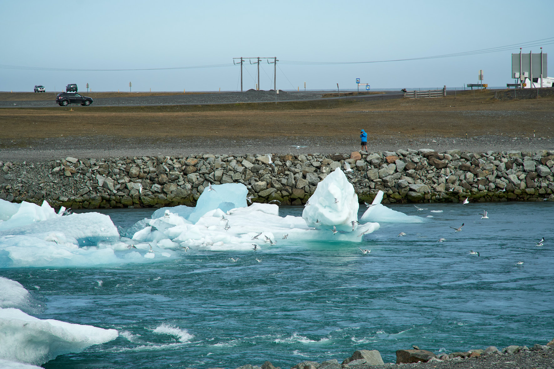 It should be emphasized that even if the techniques used are rather traditional, they still ascribe to the hyper-constructive method and are intended as the means to delineate the presence of various different kinds of objects and their interconnectedness: they fumble about the relations forged when they (de)couple with one another; they speculate about their ‘inner lives’; and they explore human culture in its constant state of negotiation with the former. For instance, all three images on the left demonstrate objects as they (de)couple with one another: a glacier giving birth to floating icebergs, a whale blowing away the water from its lungs, a seagull leaving a ship’s mask. Then, in the image below, an eclectic compendium of (other-than-)human objects are shown to co-exist and to engage with one another: icebergs float, while seagulls fly around them, while a tourist attempts to single out a meaningful frame to capture with their camera, while electricity travels across wires, while vehicles move alongside a road artery, and so on. Other than just valid instances of landscape photography, such imagery also succeed in zeroing in on the interconnectedness of complex objects at some microscopic or macroscopic level. The same principle perturbs the way audio and radio frequencies are explored, so that societies of objects, hybrid (human) activities, and the ways the may interrelate are also accounted for through their acoustic/radio footprints.