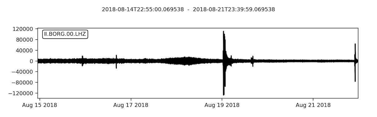- Continuous seismic data from Keflavic, IS over a period of several days, that have been retrieved from the IRIS data services employing a Python API; both audified—i.e., performed as if an audio file (listen to an excerpt below, subwoofer is necessary) and graph-visualised (see graph below).