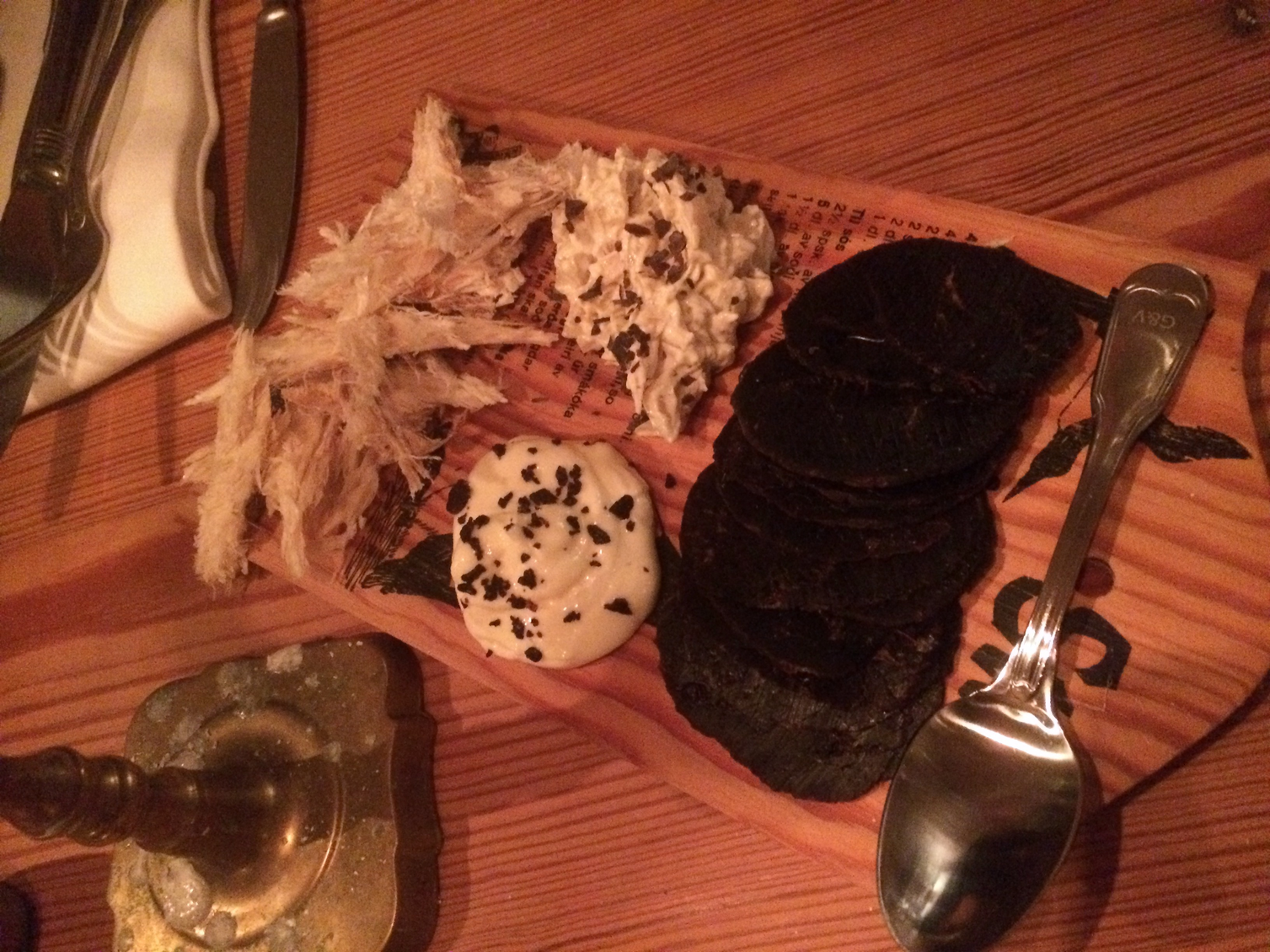 The tactility proclaimed above is furthered to include odours, tastes, and related cultural activities. The idea to involve the preparation and/or consumption of seafood has surfaced Stories of Flights, Feries, and Fish and is also explored by a couple of other artists in this context: Jørgen Teller would serve canned octopuses with a toothpick, while Jacob Riis would prepare a meal based on cod, onion, and potatoes in perfect synchronisation with the reproduction of an audio composition of his. Even if culinary practices only exceptionally appear in environmental media art or ethnographic/anthropological research, it is both common knowledge and scientifically sound that they can become important probes for cultural understanding17. Nordic culinary practices —both contemporary, traditional, and improvised— perturb Sāk vitt ok vītt of verǫld hverja. The author has conducted extensive (albeit rather informal) research in situ, visiting places where fish is caught, processed, and sold, studying literature and cookbooks, gathering information from locals, tasting dishes and local specialities, and experimenting self with local ingredients and techniques (see also the slideshow below).