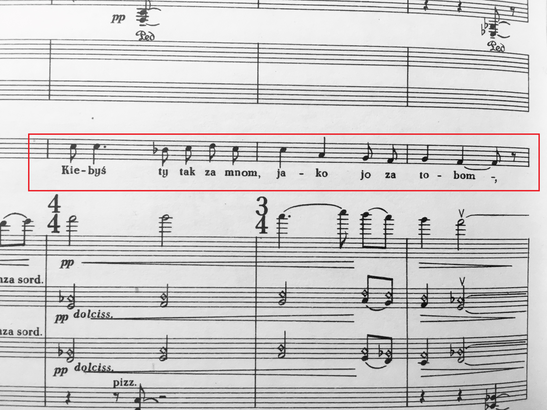 - In the last scene- number 9, the famous tenor solo (which will be an important section for the violin -piano transcription of the piece) there is a citation of the song Powiydzze mi, powiydz do uska prawego (examples below)
