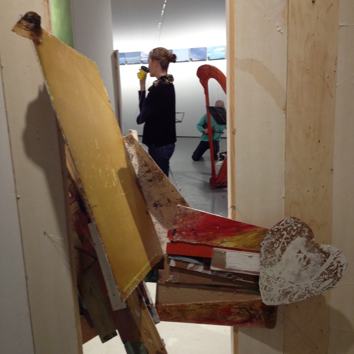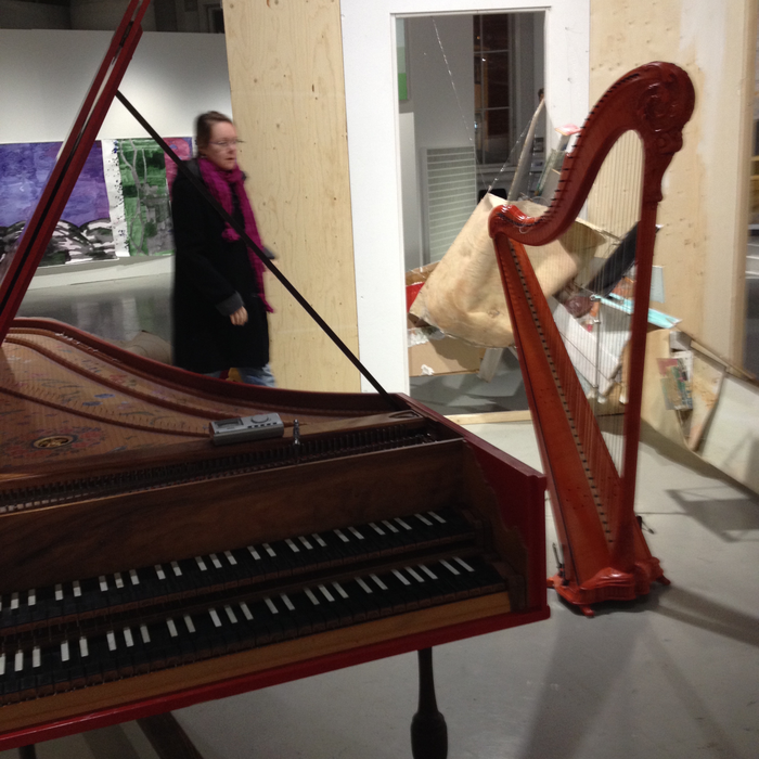 Tapasin näyttelymestari Harri Monnin vasta sitten, kun tammikuun näyttelyn rakentaminen oli jo siinä vaiheessa, että alkoi olla selvää, mihin kohtiin me voisimme asettua soittiminemme. Harrin ehdotuksesta soittimemme sijoitettiin aivan näyttelyn keskellä olevan pitkänomaisen teoksen, Johan Berglundin Fata morganan ja Lasse Juutin Hahmoutuvan maalauksen väliin. Tapasin nämä molemmat taiteilijat rakennuspäivänä, esittäydyin ja kysyin voinko ottaa kuvan heistä ja rakentuvasta näyttelystä.