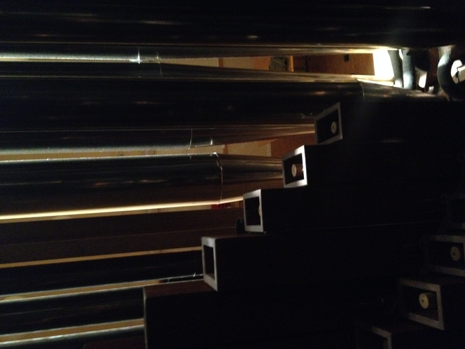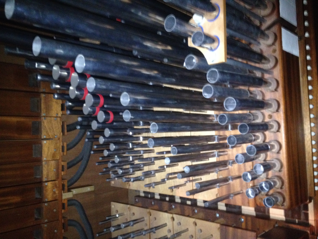 In the first tableau, the listener is placed in an abstract city of organ pipes. It is constructed of recordings of individual pipes from all four of the organs in Malmö, placed near and far, like many different structures. This section also simulates standing inside of an organ which has exploded into a vast landscape, and so employs a kind of ”speaker choir” technique, where each individual speaker becomes an individual organ pipe or two. The depicted scenario is also impossible, since the recordings are from four different instruments.