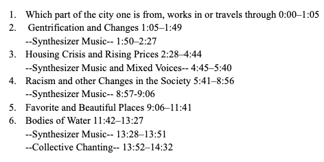 The subject-based sections of the piece are built through methods of collage, rather than as longer, fixed tableaus. The finished sections careen in near-constant motion between stories, conversations and glimpses of rooms or scenarios, some left in a single form, some combined. The field recording and synthesizer processing here is not made to create stationary places, but rather to create that motion, as if the people who listen are traveling through the city on some ephemeral, multi-directional bus. Because the sections around subjects are both dense and non-stationary, they are marked from one another with purely chordal and drone-like synthesizer material, to give the people who listen a rhythm of pauses in which to rest, and inwardly synthesize what they have heard.At the end, there is water, and more water, the city looking in on itself from all the many waterways that cross and divide its inlets and islands. Finally, all the people whose voices make up the piece chant wordlessly, perhaps pensively: a choir where the whole city sings, softly, almost secretly together as the day fades, and a final synthesizer drone-chord dissipates out into the Mälaren. Taken together, the sections of Vart ska dom ta vägen nu? collect many different stories and sonic images of the city, and map them in an ever-moving and re-juxtaposing sonic field of diverse lives and experiences, traversing the field of the room and co-traversing all the different Stockholms in the imaginations of those who listen.