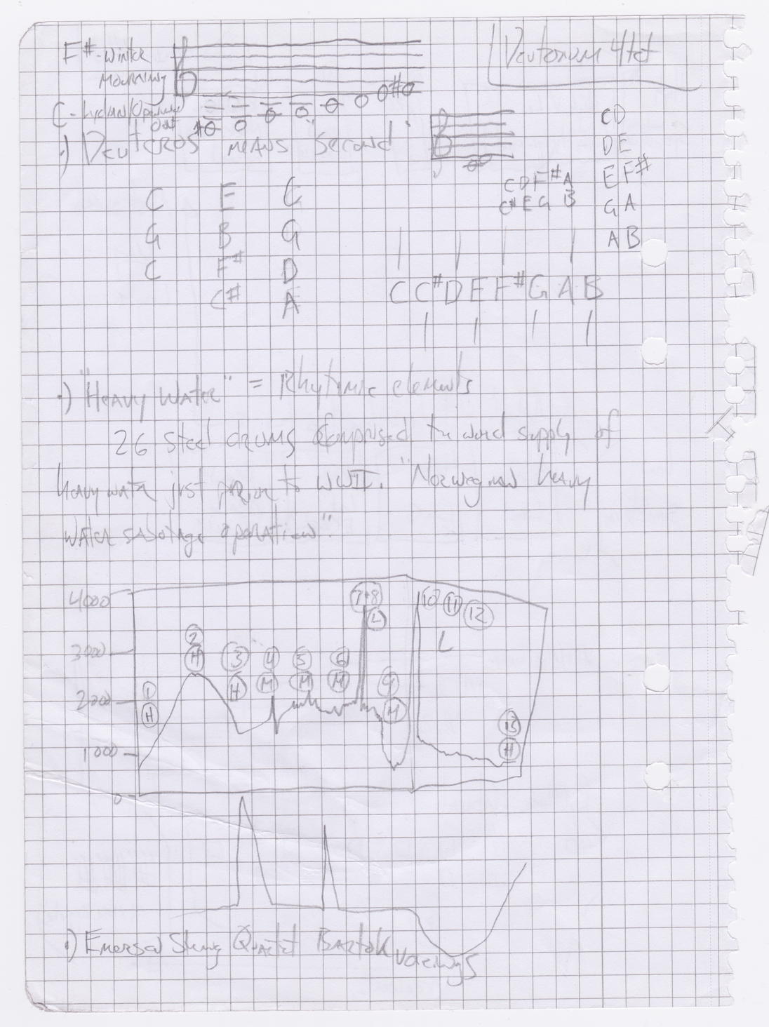 The piece is structured after data from Deuterium as a substance, using the numbers of protons, neutrons and electrons in a Heavy Water molecule as source material. I assigned note values to these, and generated drone chords from them in SuperCollider. I then created 13 modules, using this tonal material as a base for quasi-improvised drone music. This number correlates to the number of barrels of heavy water which were in existence during World War II. Heavy Water, of which Deuterium is a component, is used in the creation of both nuclear energy and nuclear bombs. These barrels were smuggled across Sweden to Norway into hiding, very likely very near Norberg on their way, preventing the Axis powers from making a bomb. The modules are of adjustable length, making the piece the length of the 30-odd minute set I was asked to create. Fredrik Bergström made a clock for us to use in the performance on a shared iPad.