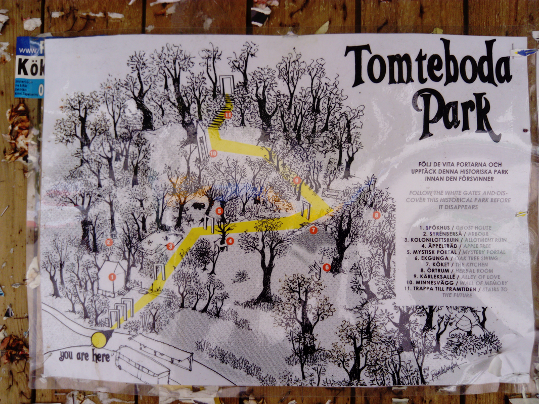 The garden has since been evicted. Some of the structures remained for several years after its demise. Other portions were fenced off. Eventually, some of the massive old trees were cut down, their trunks cut into chunks and strewn across the ruin of the garden. And finally, a bus depot was built whose new, corporate version of architectural brutality makes the old Tomteboda building look positively baroque. There is a bench with a trash can beside it which has not been emptied in years, frozen in time, behind the fences erected first to keep the former garden-keepers out of their outdoor abode, and then to secure the buses.