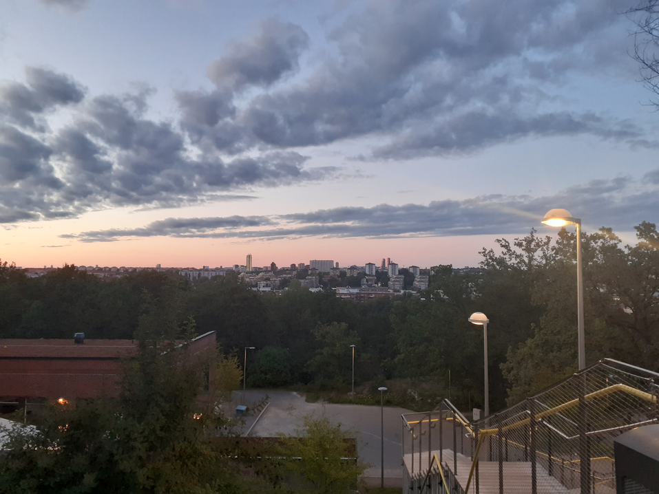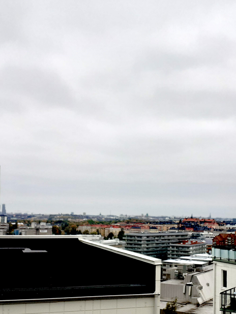 It is an evening at the beginning of November. I stand at the zenith of Nybohovsbacken, a mountain behind Liljeholmen one must climb over 150 steps to reach the top of. The wreaths and garden decorations on the 1960s miljonprogram courtyard have grown dusty, and hang limply from their moorings. The bright piles of leaves have darkened, and lie in wait for the first snow. The concrete ballast around the side of the mountain offers scant cover for the pair of deer who wander, cautious, along the precarious footpath dropping steeply below. Magpies scoff from the ramshackle frames of their earlier nest. The wearily pink winter sun has already begun to set. Its sheaves of whitish light glance pale amber off the apartment windows of Gröndal, seep across the water to Hornstull, drift over the penthouse condominiums by Kungsholms kyrka, gild the glass curtain wall of the Nordic Light hotel, redden the brick of City Hall, shimmer along the geometric windows of the Five Sisters, fade in pensive beams over Kista tower, Hagakullen, the gas tanks at Ropsten and glitter onto the eternal, shimmering carnival rides at Gröna Lund, settling into a dull, rosy glow across the northern skyline. There are no church bells, past their hour as it is; only the beginnings of the winter wind, the softly rattling magpies, and the distant sound of Essingeleden and its masses of traffic above the waters of the city.