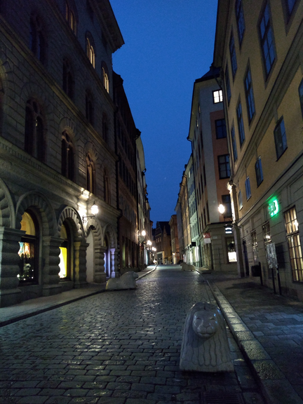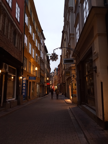 The streets are lined with 16th and 17th century buildings. They are filled with little shops, cafes, institutions and historic sites, shot through with picturesque alleyways, and are often filled with tourists. But there is a local life to this neighborhood as well. There are also music and arts venues like Musikvalvet and the Källarbyn cafe, which host all manner of music and cultural activities in their underground, stone rooms, festooned with granite arches.1 Gamla stan was also home to the iconic Pistolteatern ("Pistol Theater"), which was an important venue for new and experimental work. Many important artists in Sweden's experimental art, music and theater scenes in the 1960's featured work or performed there.2 Nationalgalleriet (National Gallery) was another important nexus point for new and experimental work from the 1980's through the 2010's.3 There are also little art galleries and artisan shops throughout the neighborhood. Electroacoustic composer Roberta Settels had a shop selling handmade sandals on the high street, which is still there under her name, and run by friends of the family.4 There is even an old bathhouse in the sub-basement of a school, which has been converted into a low cost spa, with separate evenings for men and women. It hosts a sauna, a relaxation room, and a swimming pool lit by electric candles, serenaded by Beethoven's Moonlight Sonata.