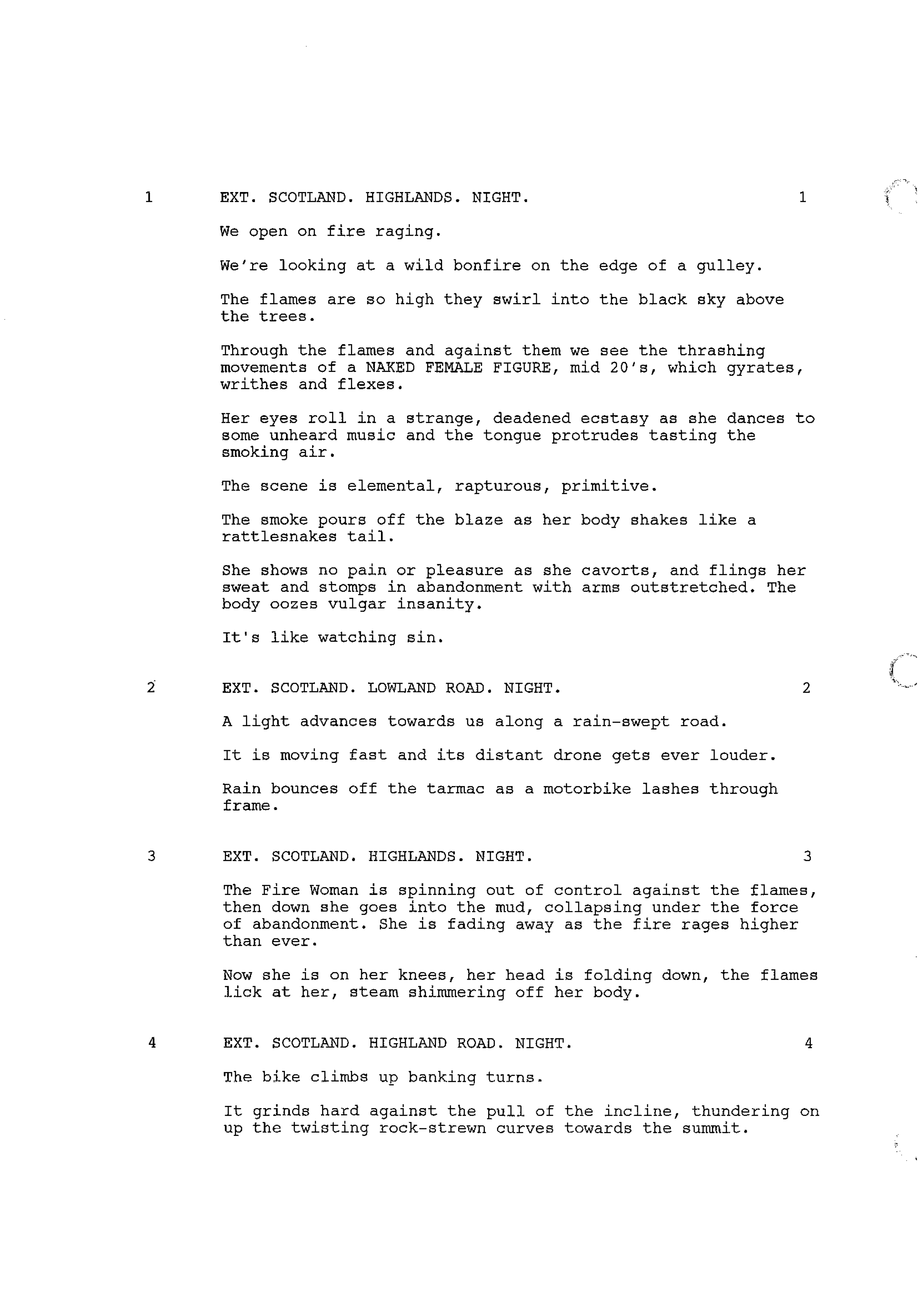 Duration is not the only cinematic quality that is hard to express in writing. A film like Under the Skin[30], directed by Jonathan Glazer and written by Walter Campbell and Jonathan Glazer is an example of a story that is very much driven by pure cinematic expression. In the screenplay the first line of dialogue is found on page 10, after 13 scenes of description of sound, images and a ittle bit of action. The publicly available screenplay is an interesting read, in that it mixes concrete descriptions of action with abstract descriptions of the intended experience in the audience.