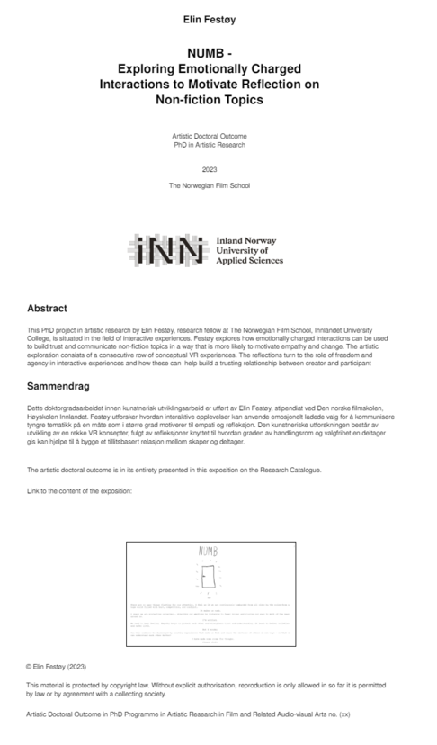 This PhD project in artistic research by Elin Festøy, research fellow at The Norwegian Film School, Innlandet University College, is situated in the field of interactive experiences. Festøy explores how emotionally charged interactions can be used to build trust and communicate non-fiction topics in a way that is more likely to motivate empathy and change. The artistic exploration consists of a consecutive row of conceptual VR experiences. The reflections turn to the role of freedom and agency in interactive experiences and how these can help build a trusting relationship between creator and participant.