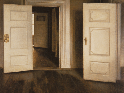 Hammershøi-kirjallisuudesta löytyy runsaasti tukea oivallukselleni. Esimerkiksi ruotsalainen Görel Cavalli-Björkman varoittaa psykologisoimasta Hammershøin teoksia ja muistuttaa, että taiteilijaa kiinnostivat ennen kaikkea esteettiset kysymykset.[11] Osipow ja ruotsalainen Ola Billgren menevät vielä pidemmälle kirjeenvaihdossa, jota he kävivät Hammershøin teoksista 1990-luvulla.[12] Miehiä kuunnellessa Hammershøi näyttäytyy abstraktina maalarina, jonka intohimona olivat ovien, ikkunoiden ja seinäpaneelien geometriset muodot.