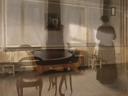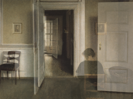 Kuvitellaan, että esseeni on talo, jossa on erilaisia huoneita. Kirjoittaessani kuljen (hitain ristikuvin) tilasta toiseen. Äsken olin keittiössä. Nyt siirryn ruokasaliin. Se sijaitsee Hammershøin kotimaassa Tanskassa, missä Pohjoismainen kesäyliopisto (NSU) kokoontui heinäkuussa 2012. Ajallisesti olen siis siirtynyt muutaman kuukauden taaksepäin siitä, kun istuin syömässä makaronia tyttäreni kanssa. Tällä kertaa istun kahvilla kollegoiden ympäröimänä. Olen juuri pitänyt presentaation työstäni ja puhumme siitä, mitä joku heitti esitykseni lopuksi: että videoistani tulevat mieleen hollantilaisen Jan Vermeerin (1632–1675) maalaukset. Se oli tärkeä heitto, tajusin, että olen sisimmältäni laatukuvamaalari ja että teosteni konteksti ei ole video tai elokuva vaan maalaustaide.[2] Äkkiä muistan kuulleeni taiteilijasta, jota on kutsuttu Tanskan Vermeeriksi. En tiedä hänen nimeään, mutta kaikki ymmärtävät, kenestä on kyse. Kahvitauon päätyttyä menen tietokoneelle googlaamaan. Hammershøin maalaukset levittäytyvät eteeni kuin filmiruudut. Kymmeniä "otoksia" samoista huoneista.
