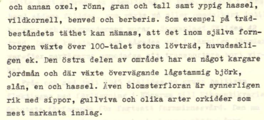 Listan över Mittlandsskogens flora kan göras lång: skogsbingel, lungört, hålnunneört, Sankt Johannes nycklar, Jungfru Marie nycklar, tvåblad, brudbröd, flockarun, skogsklocka, salepsrot. Svampfloran är av internationell betydelse. Här hittar man en femtedel av Sveriges samtliga rödlistade svampar, med violfingersvamp, slöjröksvamp och djävulssopp som några exempel. Flera sällsynta och hotade kärlväxtarter växer här, som skogskorn, strävlosta, skugglosta, gulyxne, gulkronill. Och storviolen, som är Sveriges största förekommande violart och som i Sverige bara finns på Öland. I en ansökan till Riksantikvarieämbetet om att få samla in nattviol, för experiment inom evolutionsbiologi, framgår att en variant av arten nattviol (som namnet till trots är en orkidé) finns i ett särskilt rikligt bestånd intill fornborgen.