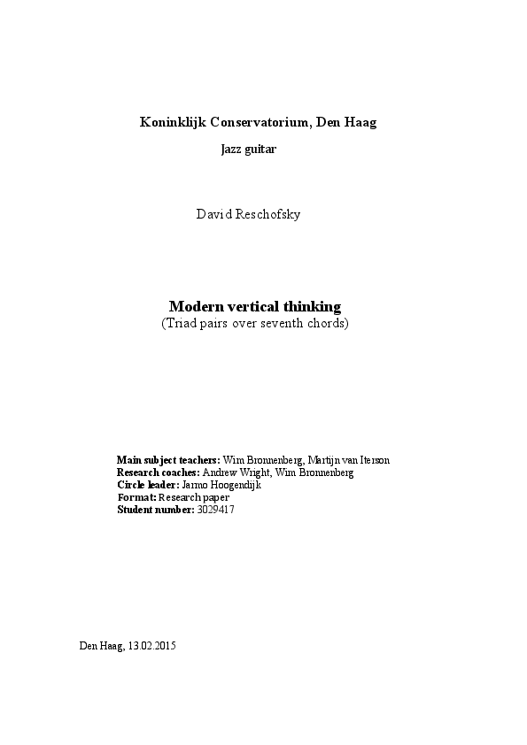 Modern jazz uses triad chords a lot. I would like to know all possible triad substitutions over seventh chords, so I will also examine this in my thesis. What I hear and what I transcribed from modern jazz musicians is that they know the main music systems and the possibilities very well. I will listen to and transcribe solos from my favourite artists and find out what kind of scales and triad combinations they use. I will then examine these systems to discover what kind of triad chords there are and how we can use them in an irregular way. So my main question is, how can I use the concept of triad pairs to express the sound that is in my head?