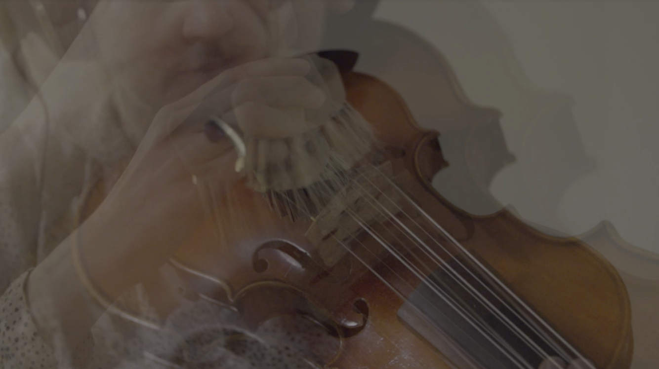 Behind us, on the floor of the studio at Akademie der Künste in Berlin, amongst coffee cups, umbrellas and a container of strawberries, lies my wooden potato brush from the kitchen at home. It’s a small and simple brush, yet it plays the leading role in the texture we listen to. I show Carola the ways I used it. When recording, I let it play the buzzing of plucked, damped strings that neither bow nor fingers could create.