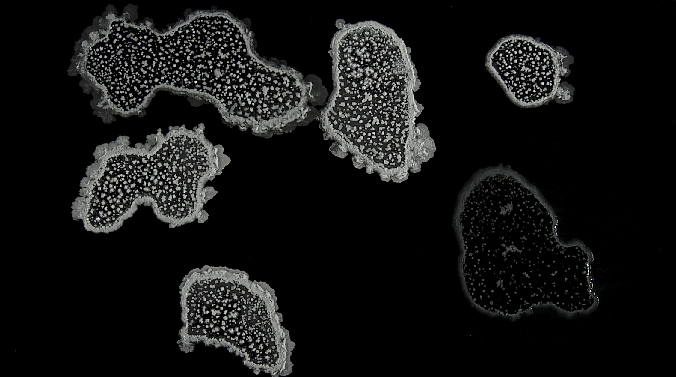 Some months into the work, our collaborative duo expands to an interdisciplinary trio, as video artist Eric Lanz joins the work on Solastalgia. We ask Eric if he has an existing work that might fit our theme, and we are happy when he offers to create something new with us. He himself has been wishing to address solastalgia in his work. In his studio in Düsseldorf, Eric run experiments in salt and water that we now watch here in the studio. The motions of the video, of fading landscapes of salt, evoke feelings of loss. Through the technological experimentation with time that Eric’s advanced software offers, processes can be speeded up a thousand times, or run backwards. His pictures of fading islands of salt – or ice – lend Solastalgia another artistic layer.