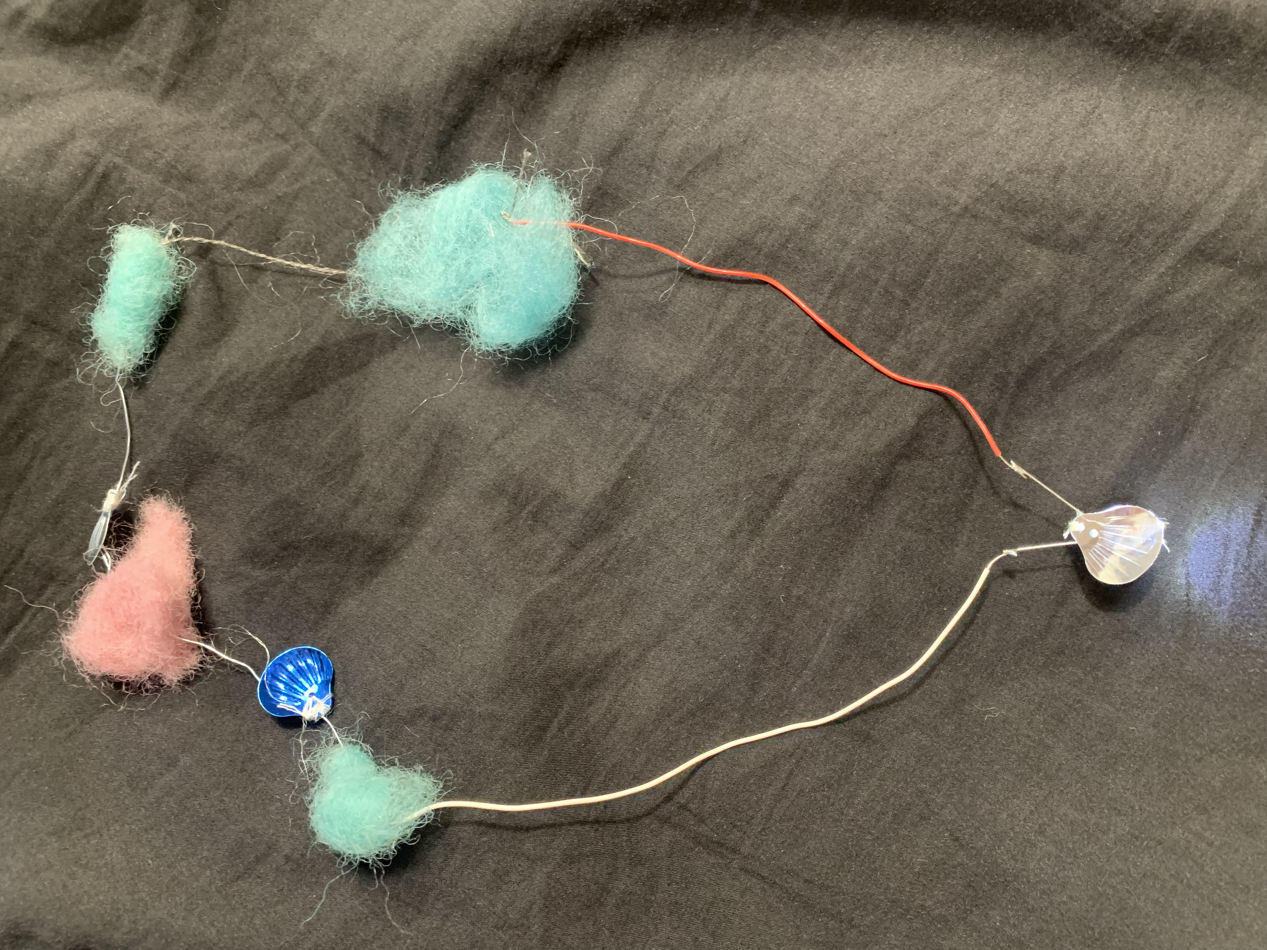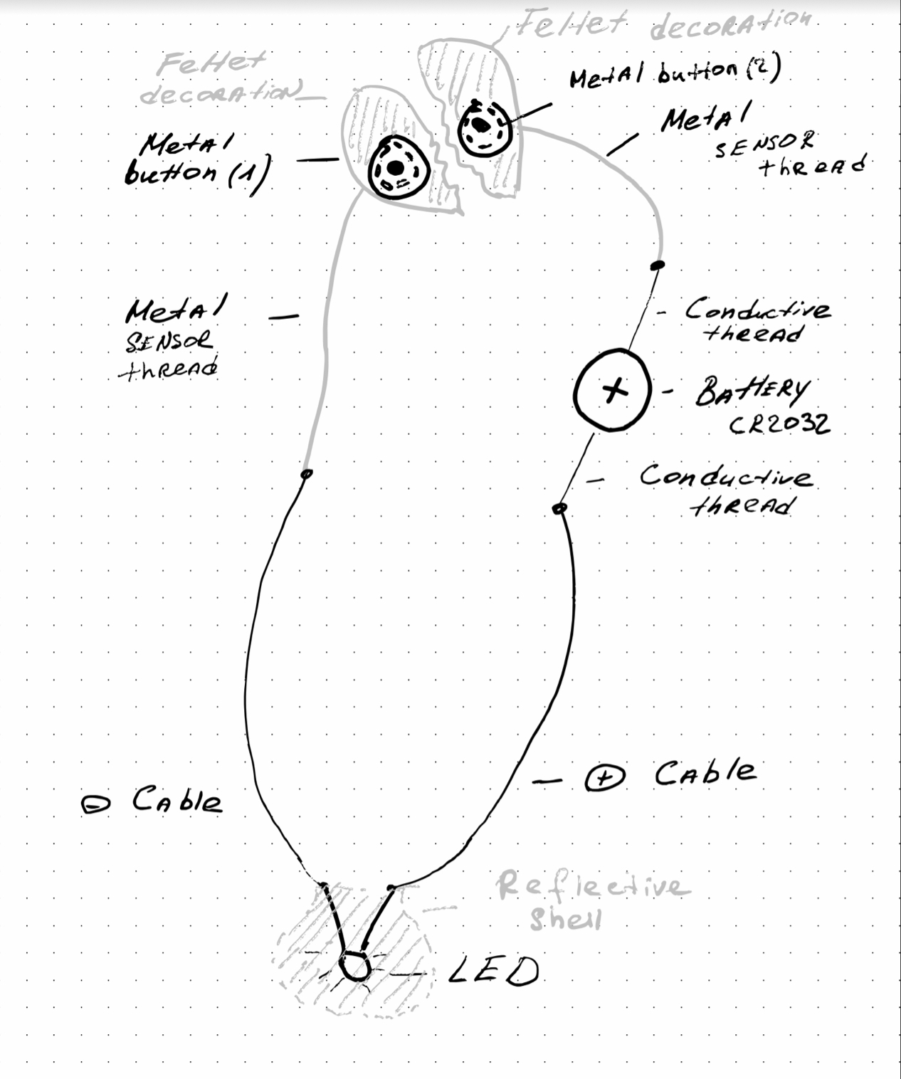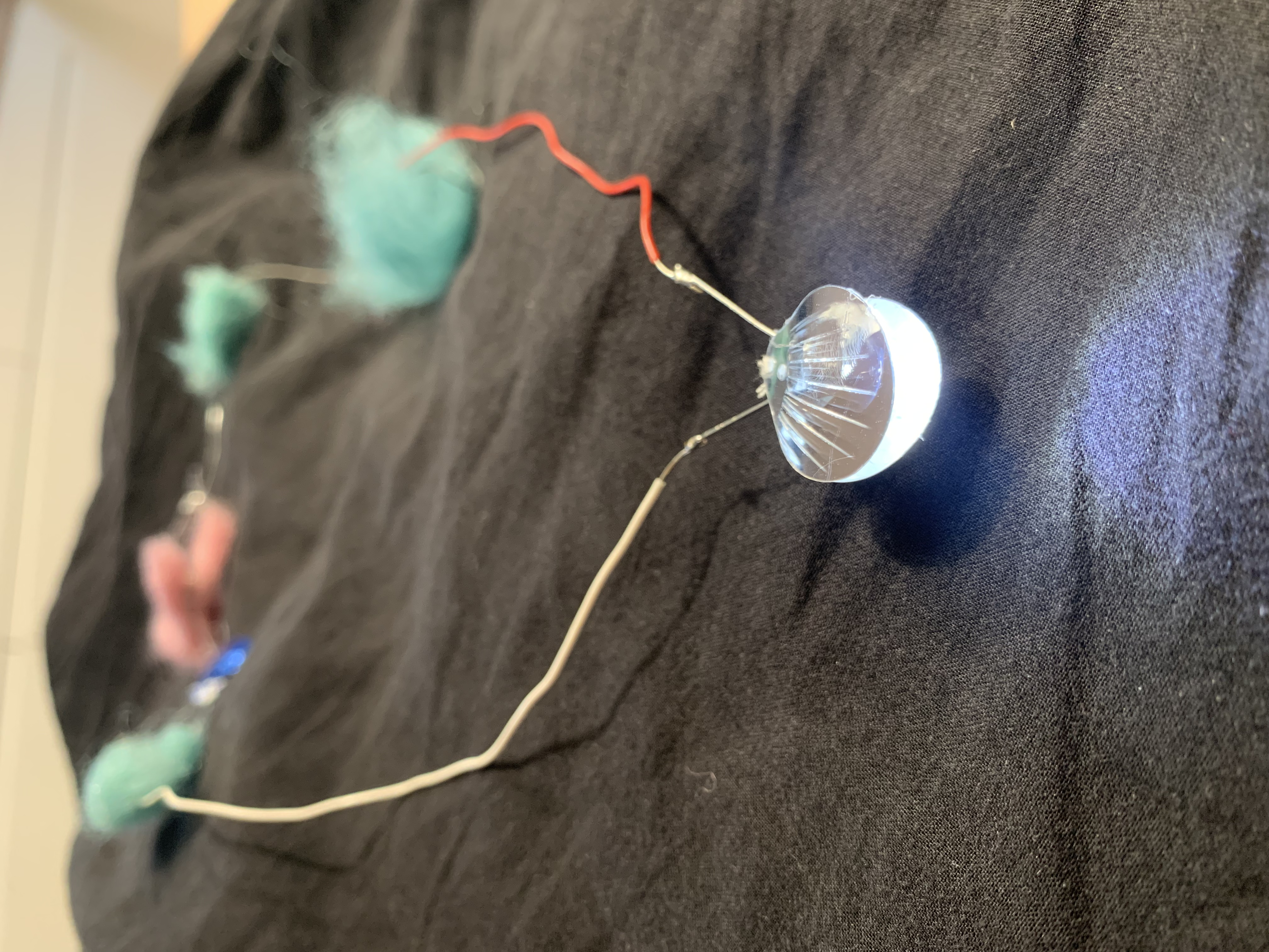 The user interacts with the prototype by connecting two parts of a metal button which are connected to the sensors by conductive threads. Light is activated when two sensors connect to each other. Interaction is intuitive and easy as connecting two parts of the whole together. Felted halves of the heard help to indicate that the pieces should come together.