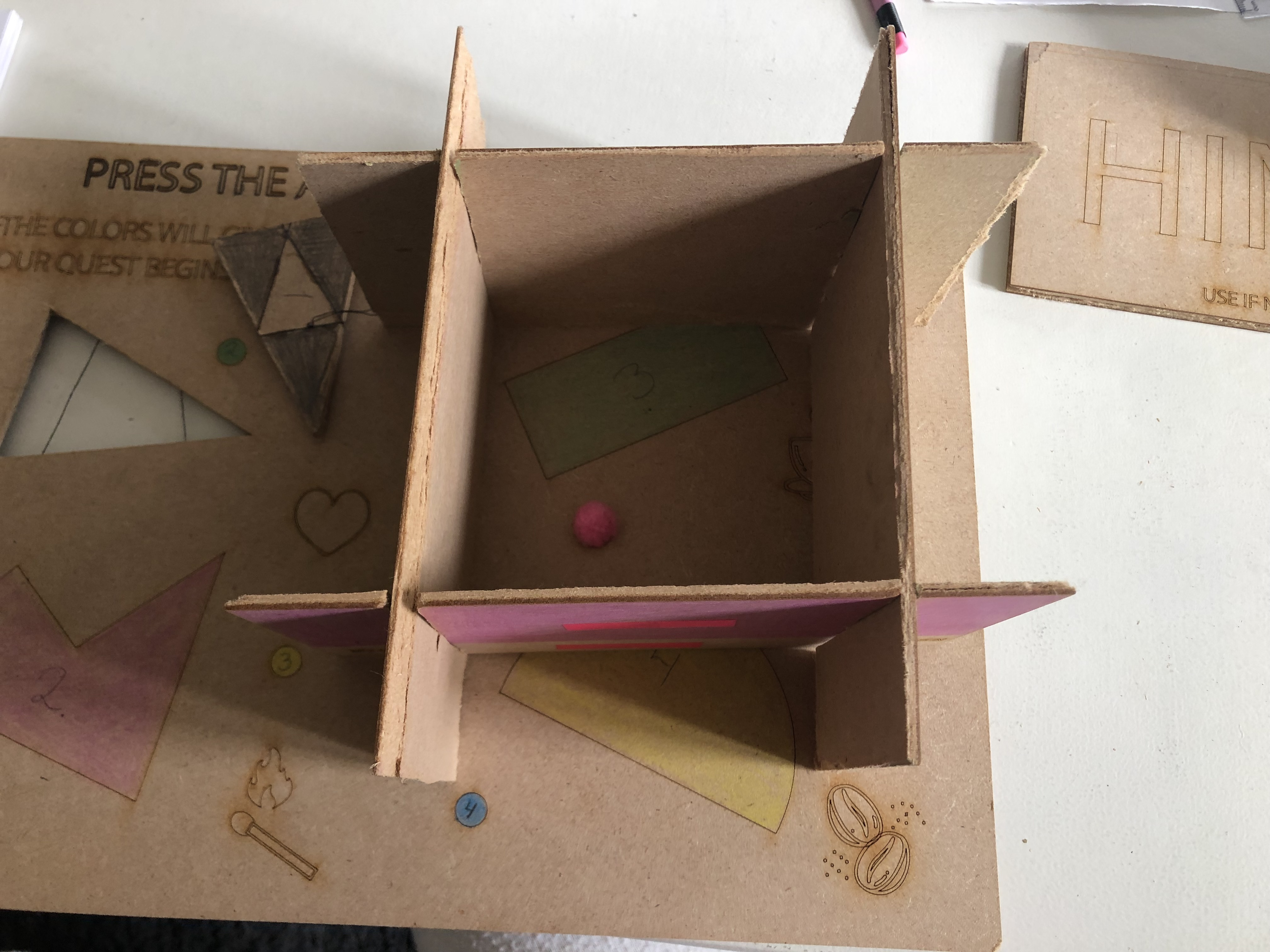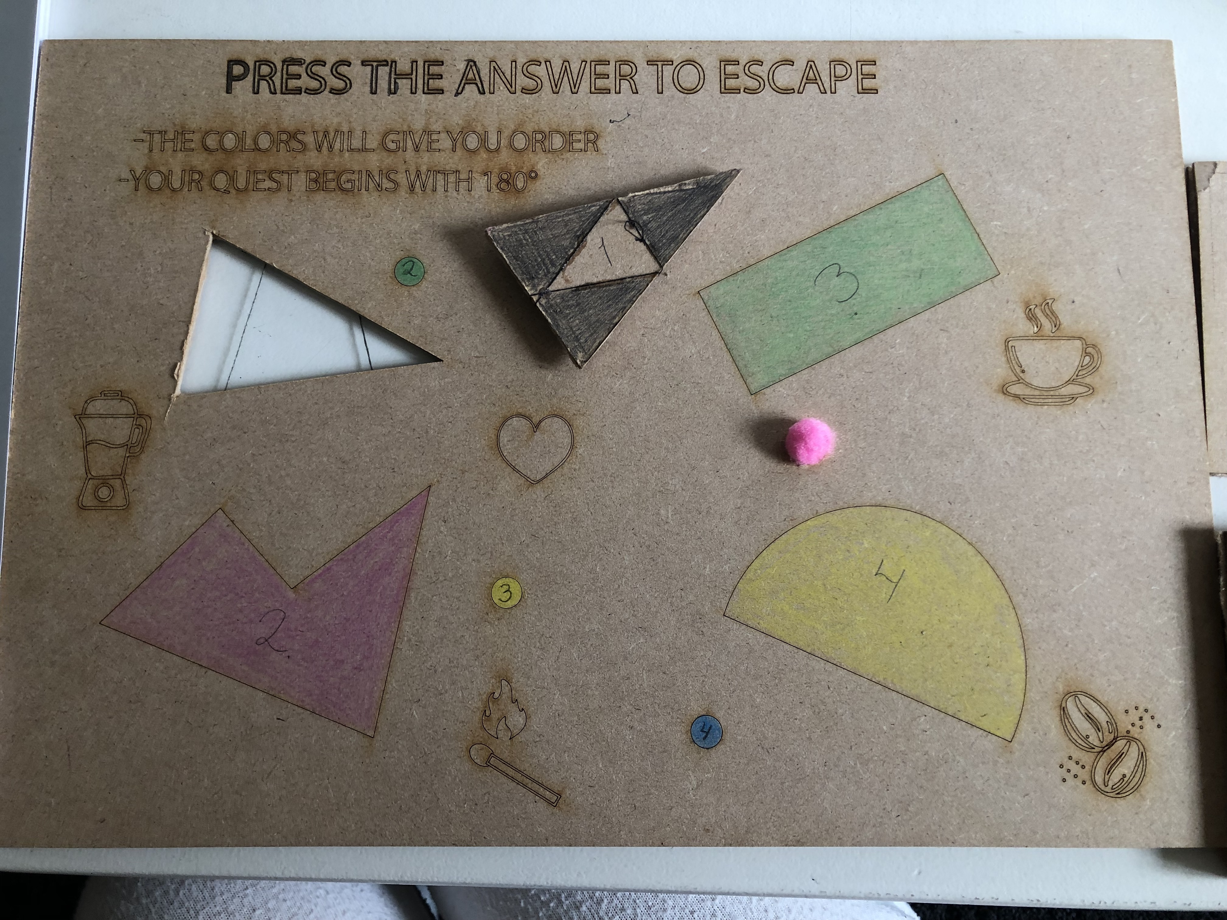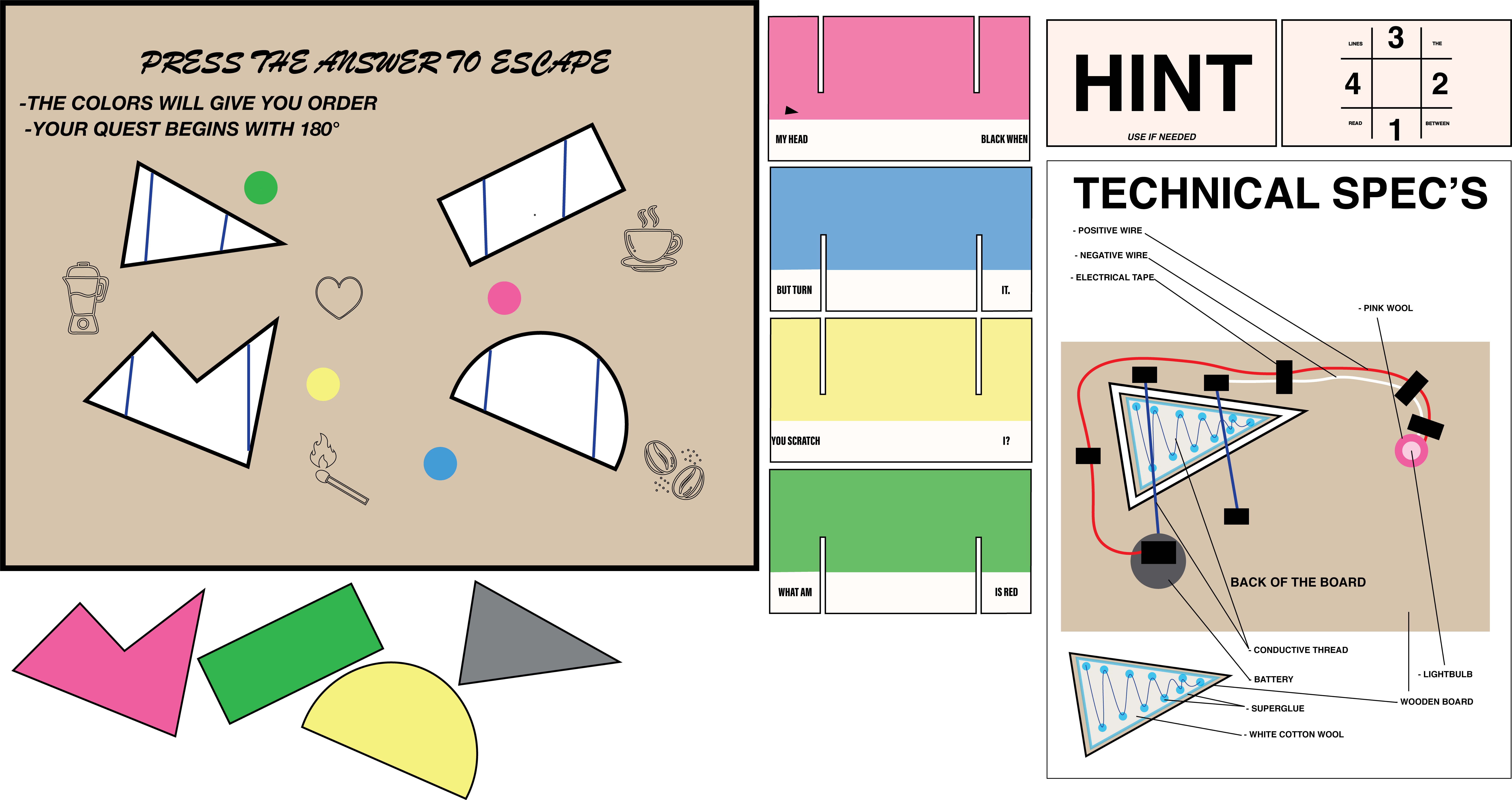 Imagine you are in a dimly lit room with a locked door. In front of you, you have the board, 4 puzzlepieces of different shapes, 4 colored pieces with text on them, and a card facing down that has “Hint - use if needed” written on it.