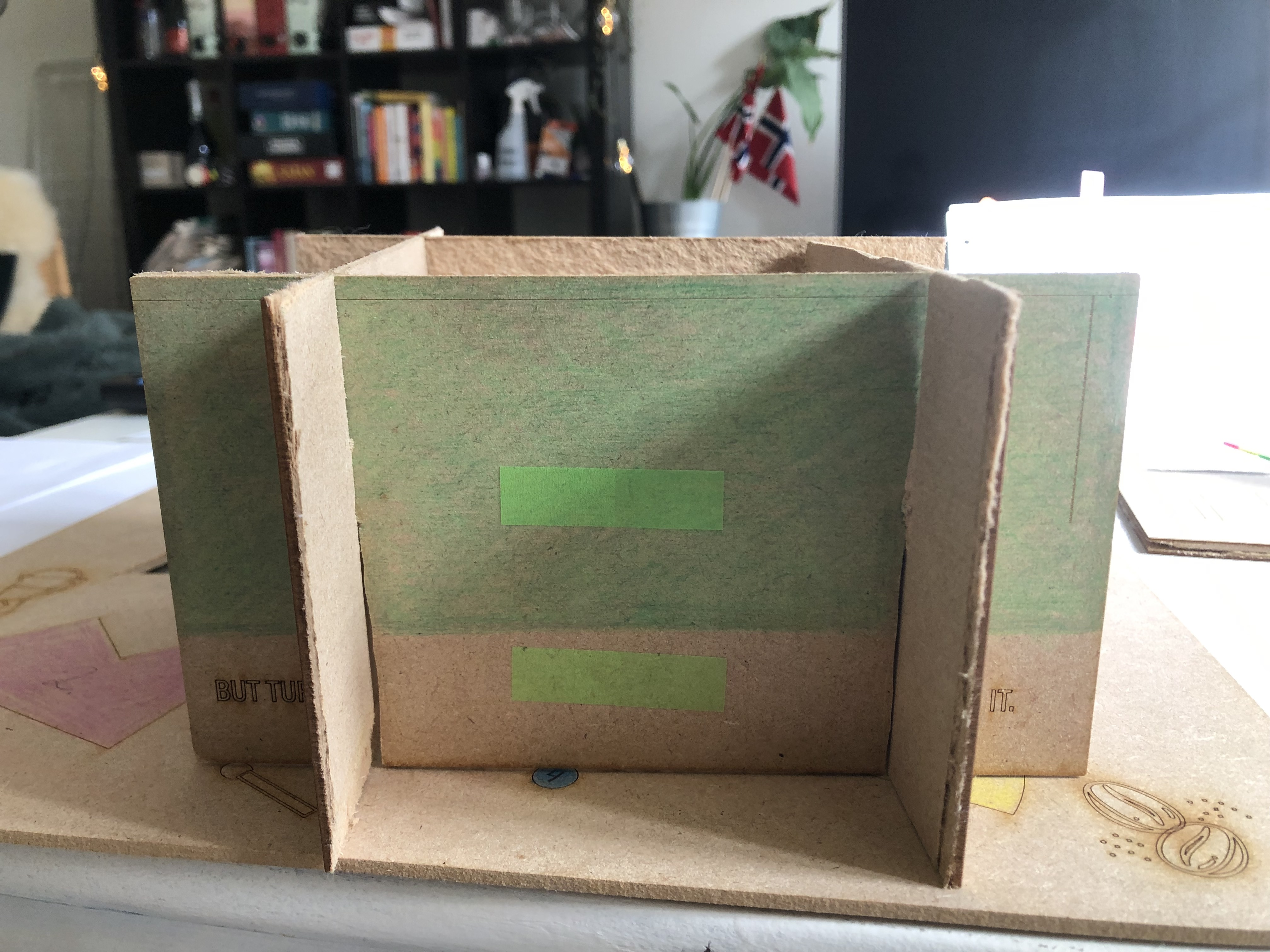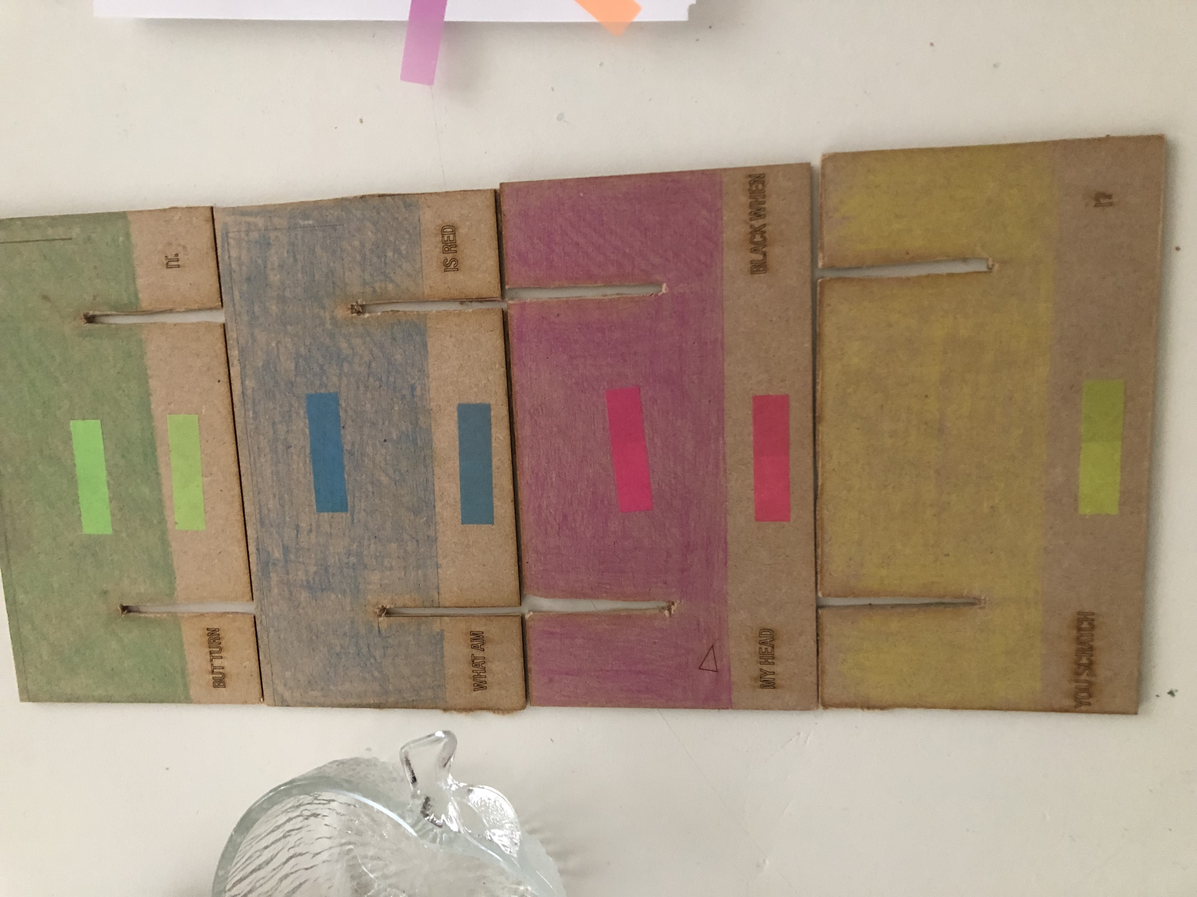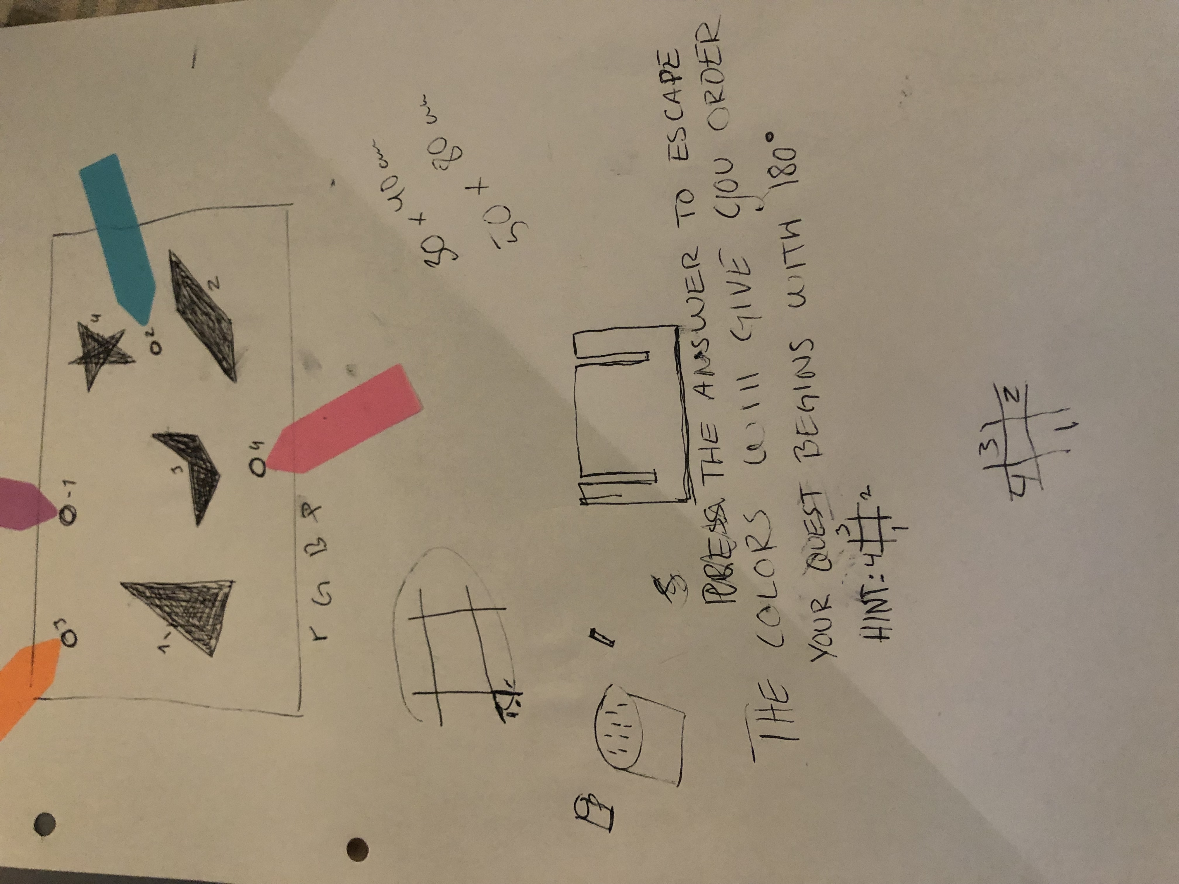 Imagine you are in a dimly lit room with a locked door. In front of you, you have the board, 4 puzzlepieces of different shapes, 4 colored pieces with text on them, and a card facing down that has “Hint - use if needed” written on it.