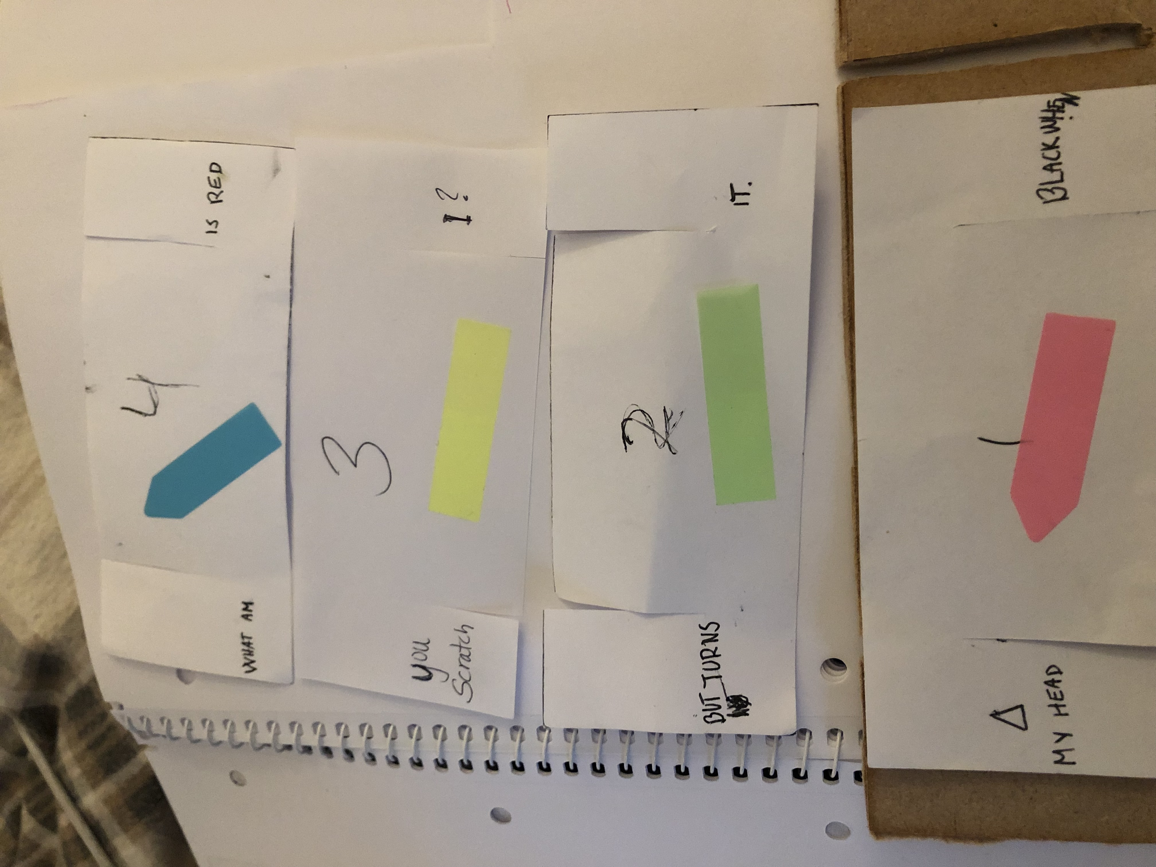 When assembled it reads “My head is red but turns black when you scratch it. What am I?”