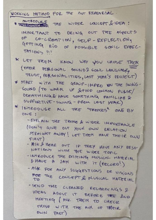 For everyone, playing in ‘someone’s band’ and yet having as much freedom and an expectation to communicate through one’s own perspective was rather a new form of making music. Over time, throughout this short working process, everybody started to open up more and more, showing their own thoughts and incorporating them into the work creation process. On the other hand, in the very end of the project when very little time was left, I noticed that the focus slightly shifted away from the outlined approach of putting one’s practical experiences and emotional connections behind the music. As a takeaway for the next time, I will be aware of that phenomenon and ready to prioritize quality over quantity.