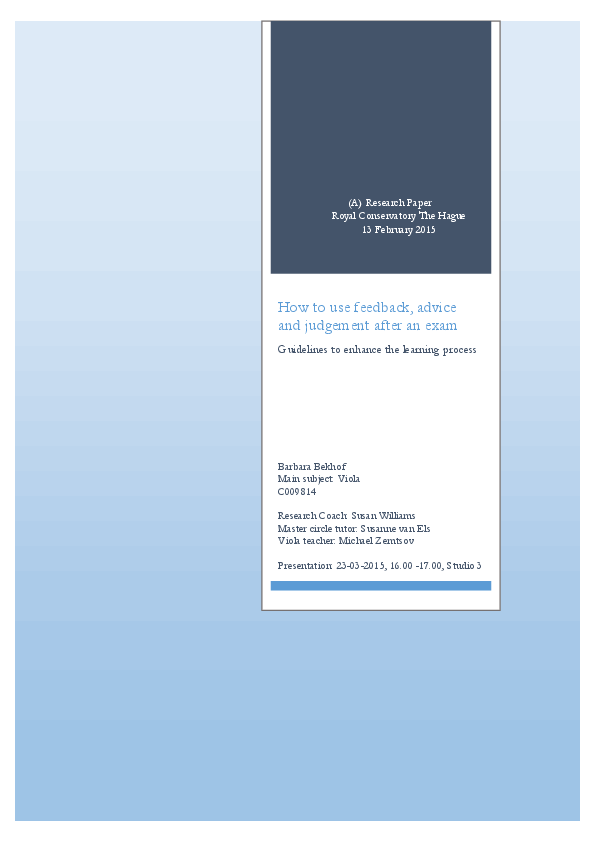 Abstract Name: Barbara Bekhof Main Subject: Viola Research Coach: Susan Williams Title of Research: How to use feedback, advice and judgement after an exam Research Question: How can feedback, advice and judgement be used in such a way, that it contributes to the learning process of the students? Summary of Results: This research paper is to conclude the study at the Royal Conservatory. This paper answers the question of how to use feedback, advice and judgments during an exam, and during the preparation of it. Feedback is information about how we are doing in our efforts to reach a goal. Important when giving feedback is that the learner is aware of receiving the feedback, and that the comments are objective. Advice is an opinion or recommendation offered as a guide to action. Important when giving advice is that the person receiving the advice is willing to receive advice and understands on what feedback the advice is based. A value judgment is a judgment of the rightness or wrongness of something or someone, or of the usefulness of something or someone, based on a comparison or other relativity. Judgement is an important part of an exam. For students it is important to know what the criteria are, and towards what they have to work to. To understand more of the learning process, different aspects of playing a string instrument are discussed in the fifth chapter. These aspects are technical facility, musicality and performance quality. The different phases in a musician’s preparation are discussed in the sixth chapter. From learning the score till mastering a piece. In this research all those aspects are combined to offer a guideline for juries and guideline for teachers during the preparation. Recommended for the examinations of the Royal Conservatoire would be to draw up a set of criteria, which are clear for the students and for the teachers who will grade the students. Biography: Barbara Bekhof (1991) first started playing the violin at age 6. From age 12 she attended the external preliminary program of the Royal Conservatoire, where she was taught by Koosje van Haeringen and from 2008 viola with Liesbeth Steffens. After graduating from the gymnasium, she went on to study Building Engineering at the TU Delft, while simultaneously continuing the viola. In 2013 she received her bachelor diplomas for both Building Engineering as Viola. Her masters at the Royal Conservatoire enabled her to go on exchange to the Haute Ecole de Musique in Lausanne, where she studied under the renowned violist Alexander Zemtsov. After her return, she continued her master with Michael Zemtsov, as well as the master Urbanism at the TU Delft.