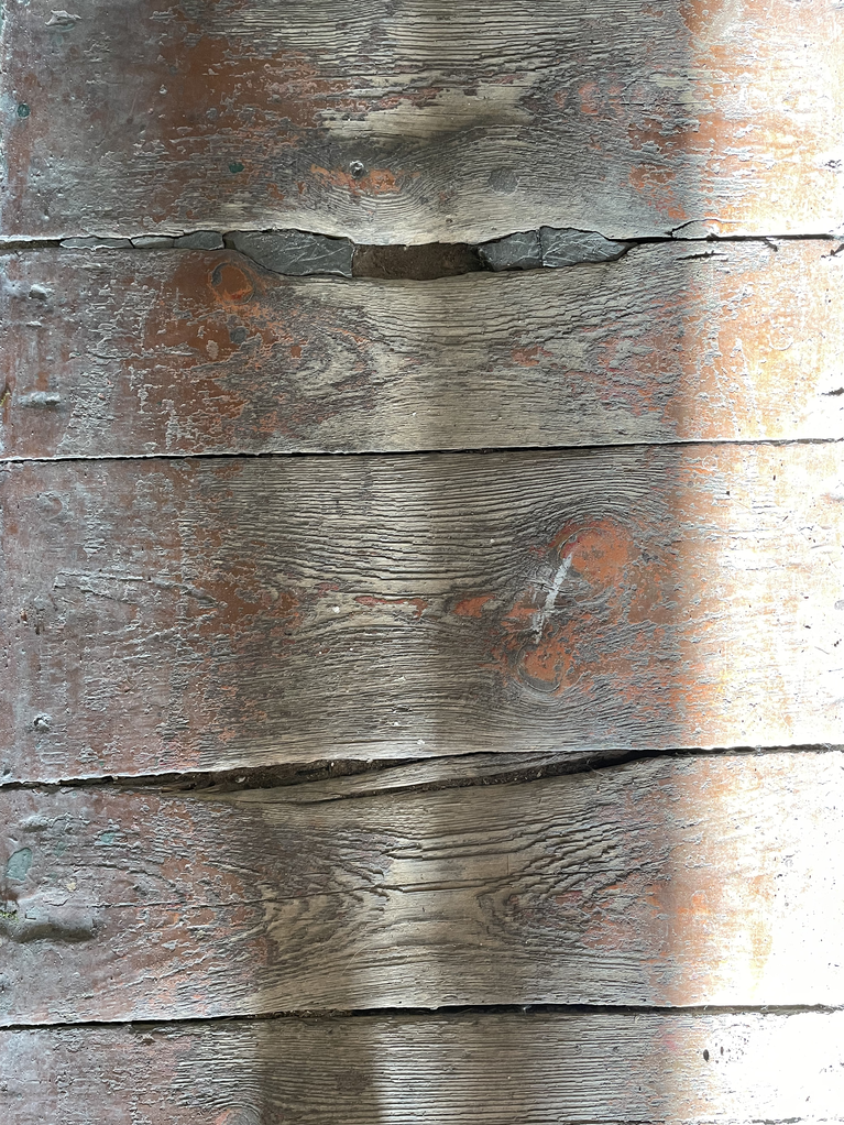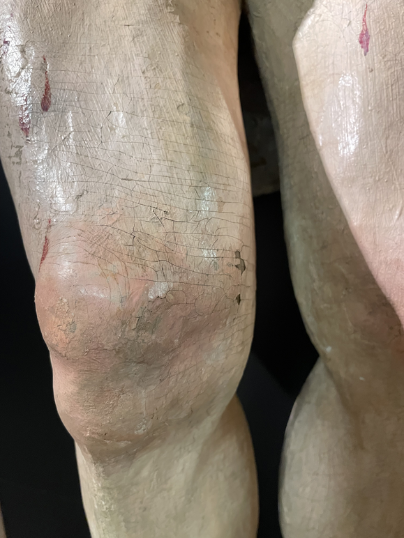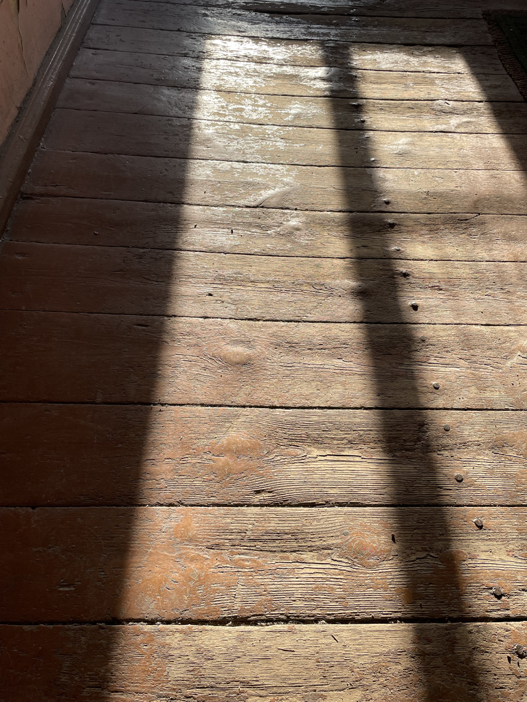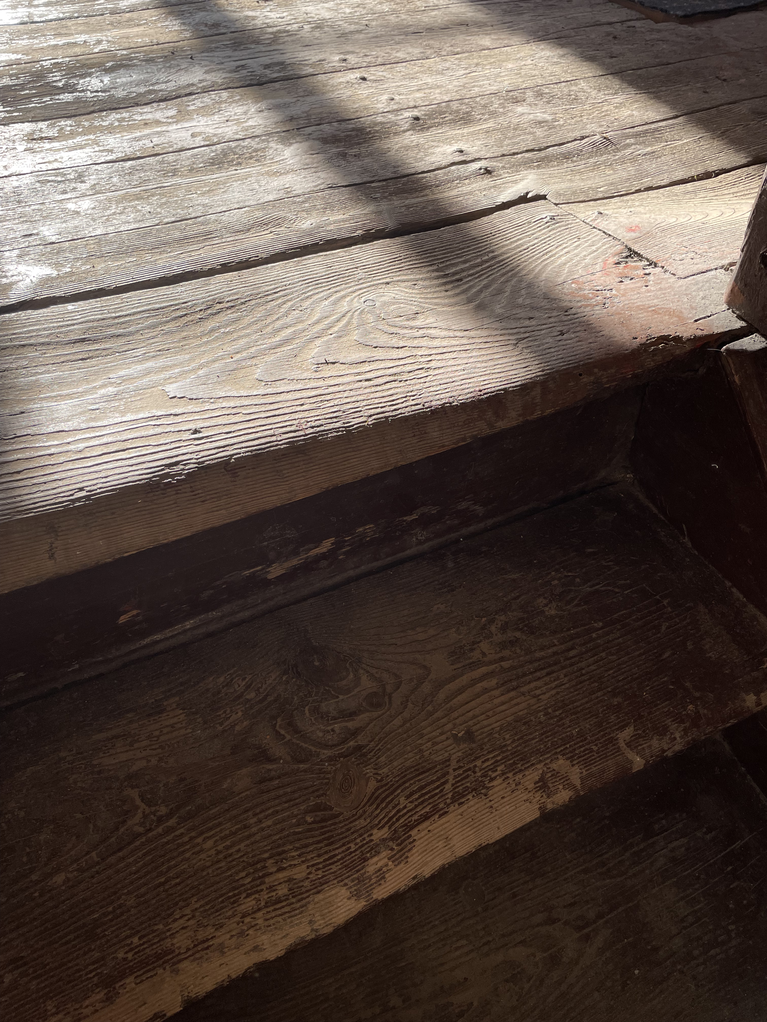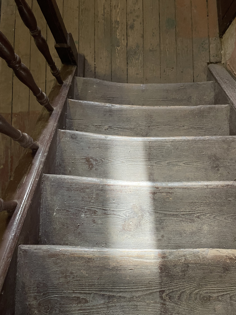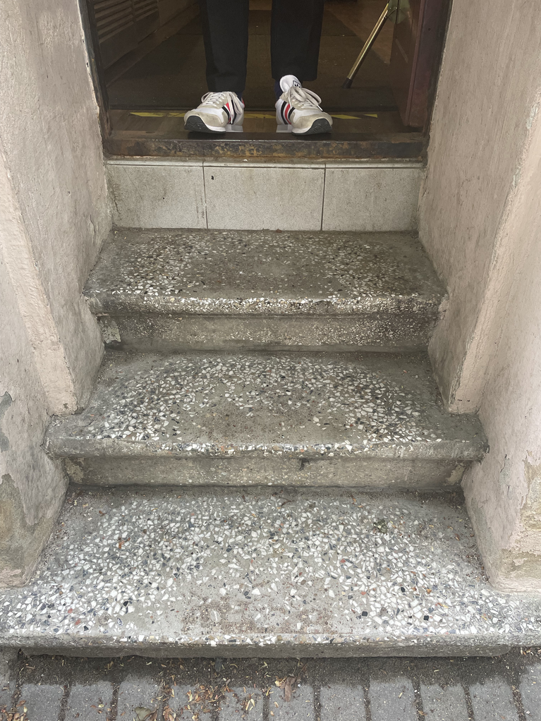 In parallel, I started to take photos of worn-out places/ objects in Vilnius. This made me think about the stairs of the chapel of the Gates of Dawn. The worn-out stairs are literally by the human bodies, by their knees. The stairs weren’t there anymore. It was the first and perhaps most memorable place in my childhood to encounter unconditionally devoted believers and their physical practices: kissing the legs of the Crucifix and climbing the stairs on the knees of the gallery to the chapel. A cold smell of frankincense and myrrh, like the entrance to the chapel itself; revealed layers of paint on the feet of wooden Jesus Christ from kissing; polished, worn-out terrazzo stairs, wooden armrest, sticky like wax - excreted fats and liquids by the bodies.