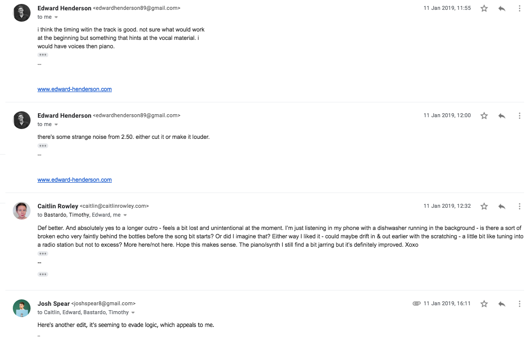 The composition happened in the editing and it was largely left to me but I share the numerous edits and suggestions in the form of email conversations with the group below. The group offers bold and significant contributions that pertain to the track as a whole, rather than small details. At some point in this to-and-fro, my feeling was that my colleagues knew more about where and how I should steer this piece for the album than I did. In this way, this collaboration was ‘integrative’.