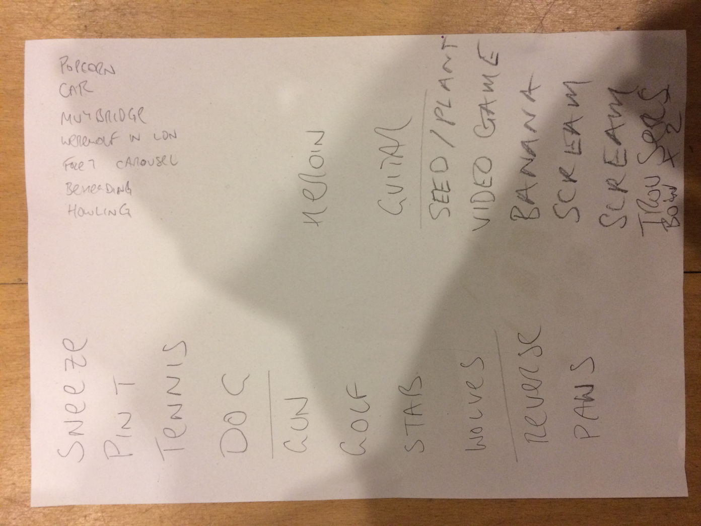 I knew that there were going to be many freezeframes, or images - as shown in the diagram, there are twenty different images (Pint, Wolf, Gun) each with four corresponding positions - and I thought it would be quicker to build this as a group. This was true not only because I had three extra minds working on the problem but because it turned out that my colleagues were solving the problem using their own creativity rather than simply imitating and learning a position assigned to them by me. If we think about it, these are two completely different tasks to an ostensibly similar end: one is creation and imagining and the other is copying. Because they have imagined and then embodied their mental image of their particular stage of ‘smashing an electric guitar’ for example, it took less time and energy for them to memorise, making the process faster. The task was for my colleagues to effectively create their own part within very clear parameters and limits to achieve a clear goal, in that there was a section of a piece to devise, with a slightly unknown outcome. I call this method, which has emerged from this research period, ‘framing’ or ‘creating a frame’.