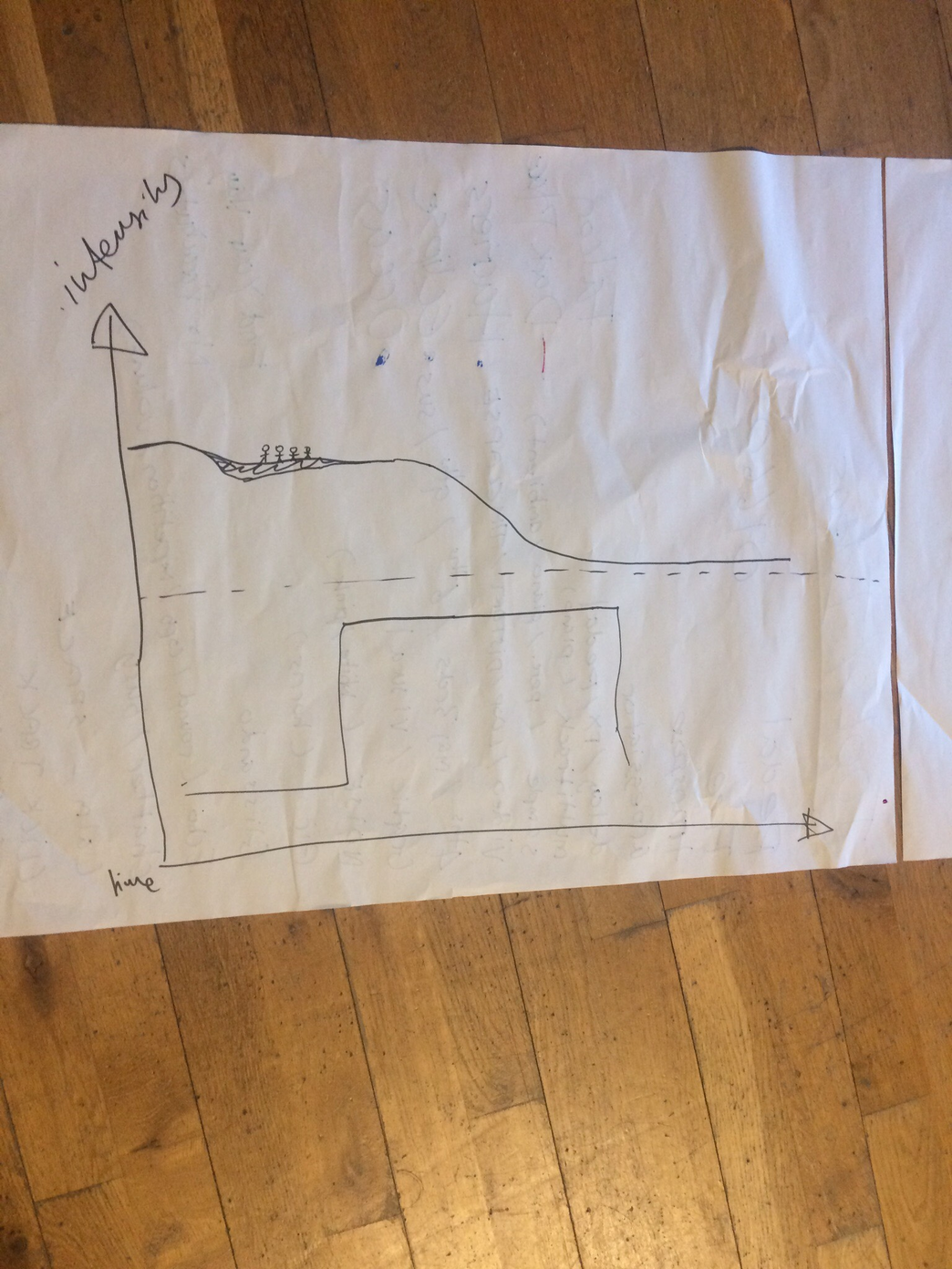 At Snape Maltings on May 13th 2019 we created a diagram of the shape of the work amounting to some kind of score. Interestingly, it was Ed who initiated this. But it turned out to be a method for visualising what we were discussing. We concluded that the changes in the backing track would guide us, behaving as a system of cues. This is one example of ‘talking in text’. To quote Heather Roche (2011): “‘Talking in text,’ in terms of the composer-performer relationship, refers to the way that the composer and performer speak using cues taken from their own training in music, from their professional experience, from the development of their own personal relationship and from their understanding of the other’s work.” (Roche, p.13). Roche is quoting from Scholar Mary Alm’s “The role of talk in the writing process”. Talking in text is evidence that participants are engaging in a synergistic relationship (Alm, 1997, p.132). Applied to our situation, where the composer and performer binary is less applicable, score-writing demonstrates an aspect of our training that we all have in common. In this example the act of score-writing was not led by one person but shared between us. What might be clear from this example is our tendency towards a library of shared jokes as well as preexisting terms like ‘valley structure’ that pushes this towards John-steiner's ‘family collaboration’.