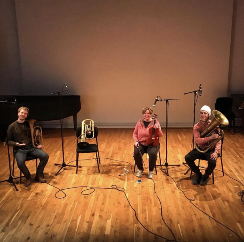For one session in our recording week in late 2018, we experimented with some small glass bottles that were leftover from my sister’s wedding. We played them with soft percussion sticks. We had no clear goal for the bottles except the idea of ‘the album’ and this decision to pick them up and improvise emerged. These points put us into flow. Because we were in flow, my memory is unclear around the details of what happened. We established a unison texture that was very striking because we discovered, as a group, that we could control the pitch of the glass. Although no one was really in charge of this, least of all me, I would credit Edward with this discovery if I had to credit someone. It should be said that my intention for the bottles was much less clear than with the brass instruments for “PrEP” simply because the brass instruments are already instruments and the bottles are not; it was not immediately obvious how to play the bottles. We recorded a couple of takes of a repetitive phrase, as demonstrated by Tim in the video, without knowing what to do with it. It happened so quickly and naturally that I did not think to document this conversation. The video below demonstrates the gesture.
