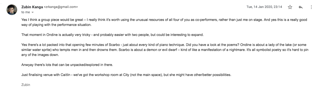 At exactly the same time that I was preparing for a workshop with Zubin in London for the end of January 2020, I was introduced to Lucia D’errico’s (2018) concept of ‘Divergent Performance’. For Lucia, these ‘performances’ do not resemble the work that they depart from but rather question the apparatus that makes such a resemblance possible, interrogating the ‘of’ in ‘performance of music’. Her task has been to depart from the original work to such an extent where only something of it is retained (D’Errico, 2018, p.16). This offered an approach whereby the context of “Daphnis and Chloé” within Ravel’s life could be material and, crucially, it caused me to consider using other music by Ravel, music which Zubin might already be familiar with. Like a detective investigating an unsolved murder or a missing person, this approach encouraged me to build a world around the piece, understanding it as an event within Ravel’s own life. When asked, Zubin told me that he was very familiar with “Gaspard de la Nuit” (1908) for solo piano. Not only did Ravel’s context and his entire body of music become material for me but so too did piano performance as a whole. I arrived at the idea of a group piece. This email demonstrates Zubin’s support for such an idea and in the weeks after, I became interested in slapstick double-acts, clowning and contemporaries of Ravel like Charlie Chaplin.