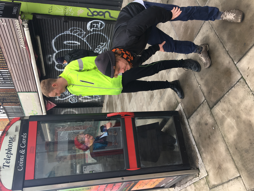 The images here show us actually visiting a telephone box during rehearsals for the piece, long after learning the choreography. This gave us, as a group, a shared, collective vision of a telephone box.