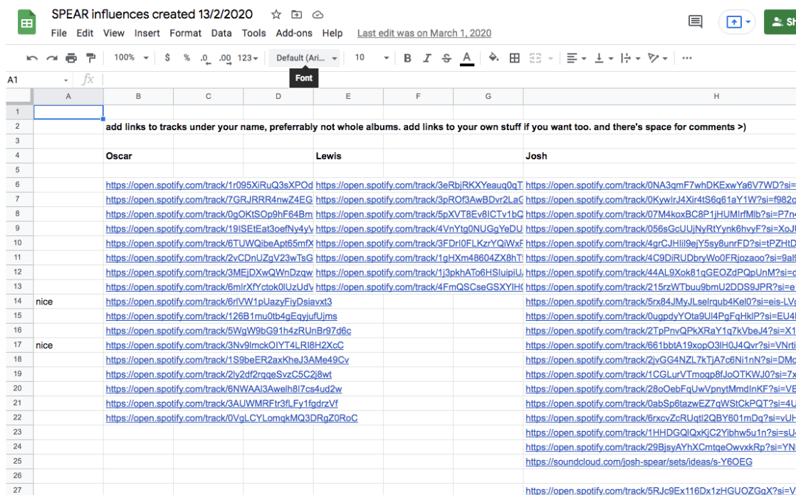 Prior to meeting in early March of 2020, I initiated a document to collate music that we were interested in. I was attempting to create a shared imagination for what we would be working on. I asked Lewis and Oscar to add links to music that was important for them at that time so we could listen to each other’s influences.