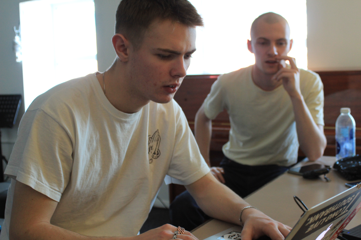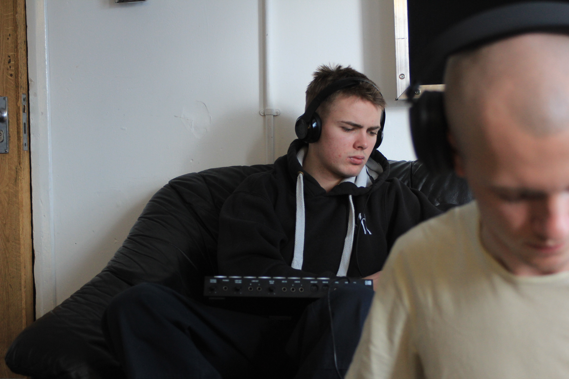 We began the session with recording Lewis playing Guitar before transforming the studio into a workspace with a desk, using the studio’s speakers as monitor speakers. We started to assemble “130”. There was a lot of off-task-talk throughout this day and humour that often materialised through singing. Cafferty and Clausen's (1997) idea of ‘off-task-talk’ is conversation that serves the building of trust, talk that is unrelated to the rehearsal or workshop but is an exchange of personal or humorous details.