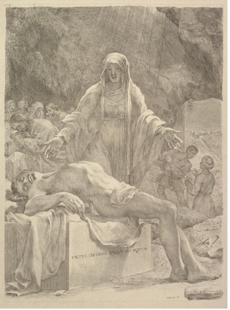 Claude Mellan’s (1598-1688) Lamentation includes a rarity in sacred artwork – the depiction of weeping men. To the left of the Virgin Mary are gathered a group of mourners (likely those mentioned in Luke 23:27), those whose heads are veiled are women, and the remainder are distinguished as men by their facial hair. These figures are not concerned with action as John and Nicodemus are; instead, they bow their heads in grief. In this depiction, the Virgin Mary is the one giving the motion towards action, gesturing with open arms towards the body. The inscription on the plinth reads ‘factus obediens usque ad mortem’: become obedient until death.